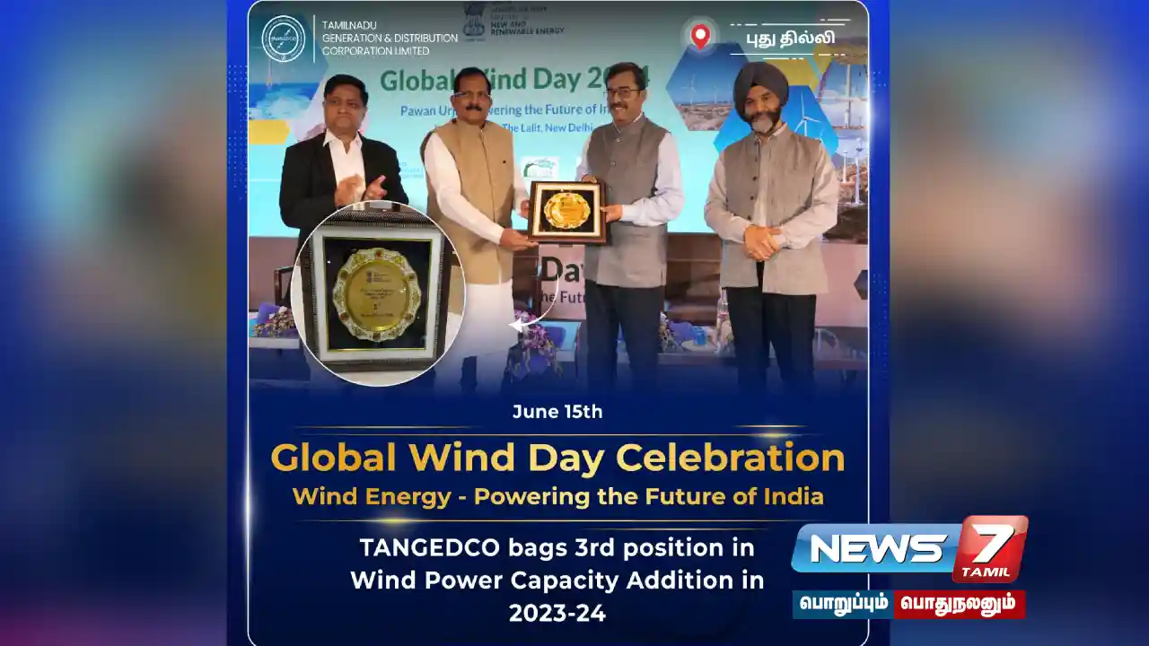 அந்த வகையில் இன்று உலக காற்று தினம் கொண்டாடப்படுகிறது. இந்நிலையில் இன்று (ஜூன் 15) தமிழ்நாடு மின் உற்பத்தி மற்றும் பகிர்மான கழகம், காற்றாலை திறன் அதிகப்படுத்துவதில் நாட்டிலேயே 3 வது இடத்தை பிடித்துள்ளது. இன்று டெல்லியில் நடைபெற்ற விழாவில் இதற்கான விருதினை தமிழ்நாடு மின் உற்பத்தி மற்றும் பகிர்மான கழக தலைவர் மற்றும் மேலாண்மை இயக்குநர் ராஜேஸ் லகானி இ.ஆ.ப பெற்றுக்கொண்டார்.