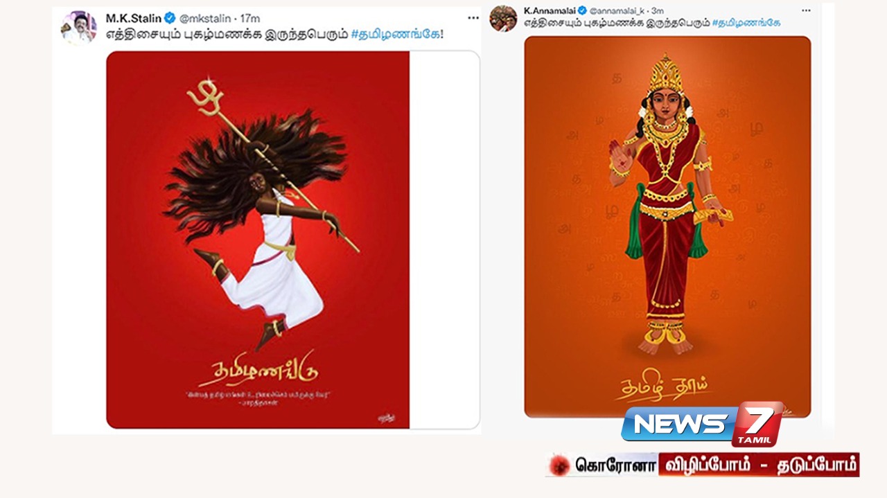 இந்நிலையில், முதலமைச்சர் மு.க.ஸ்டாலின் மற்றும் பாஜக மாநில தலைவர் அண்ணாமலை ஆகியோர் இருவேறு படங்களை ட்விட்டரில் பதிவிட்டு மகிழ்ச்சியை பகிர்ந்துள்ளனர். அதில், முதலமைச்சர் வெளியிட்டுள்ள பதிவில் “தமிழணங்கு” படமும், பாஜக மாநில தலைவர் வெளியிட்டுள்ள பதிவில் “தமிழ் தாய்” படமும் இடம்பெற்றுள்ளது.