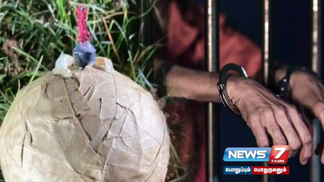 தென்காசி மாவட்டம் வீகேபுதூர் காவல் நிலைய எல்லைக்குட்பட்ட வீராணம் சாலையில் காவல்துறையினர் வாகன தணிக்கை செய்து கொண்டிருந்தனர். அப்போது, அவ்வழியாக வந்த சுரேஷ் என்பவர் காவல்துறையினரைக் கண்டதும் தப்பித்து ஓட முயன்றார். பின்னர் அவரை இரட்டி பிடித்து அவரது இரு சக்கர வாகனத்தைச் சோதனை செய்தபோது அதில் இரண்டு நாட்டு வெடிகுண்டுகள் இருந்தது தெரிய வந்தது.