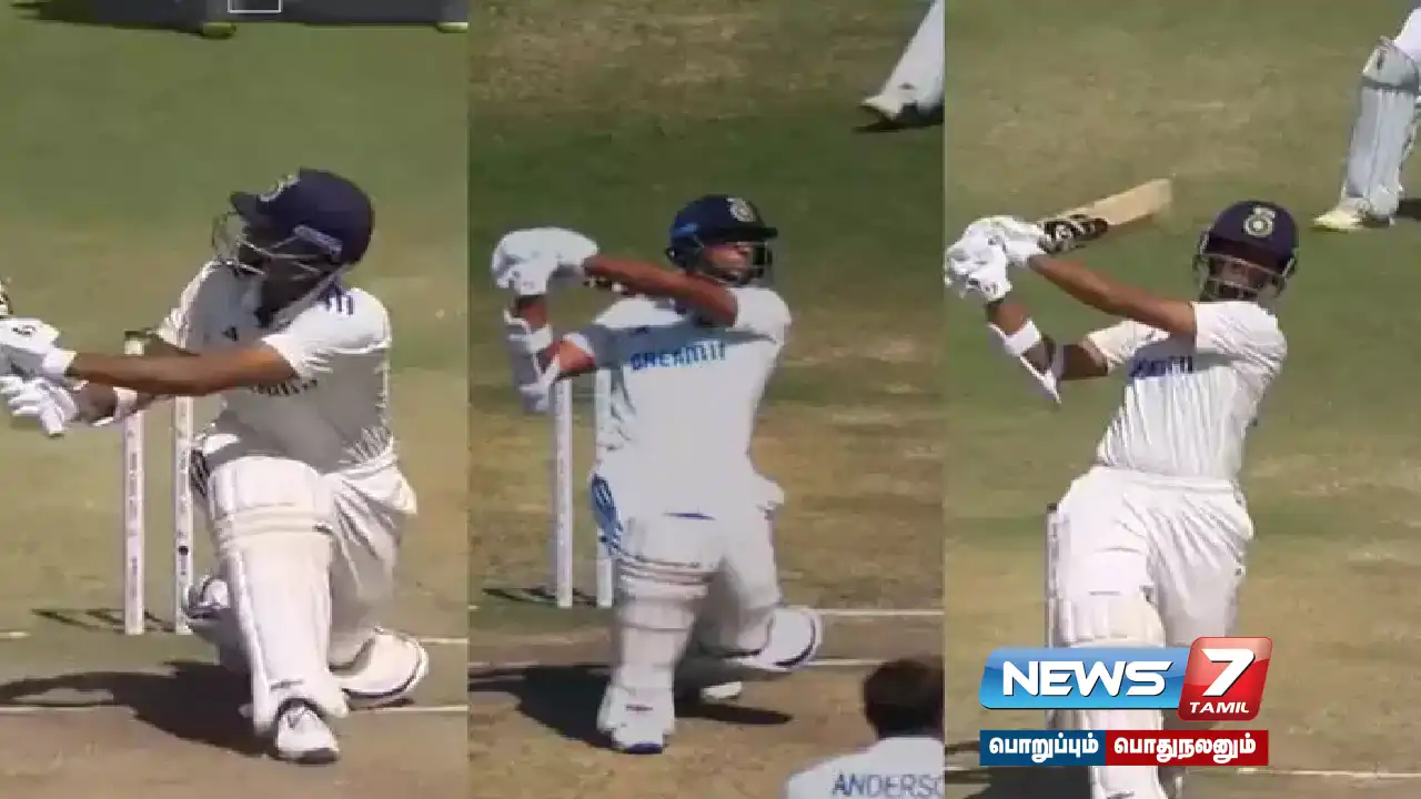இந்நிலையில், இரண்டாவது இன்னிங்ஸில் ரோகித் சர்மா 19 ரன்களில் அவுட்டானார். தொடர்ந்து யஷஸ்வி ஜெய்ஸ்வால் தனது அதிரடியான ஆட்டத்தை வெளிப்படுத்தினார். தனது 39 வது ஓவரில் மார்க் வுட்டின் பந்திற்கு பவுண்டரி அடித்து தனது 3வது டெஸ்ட் சத இலக்கை அடைந்தார். சுப்மன் கில்லுடன் இணைந்து சிக்ஸர், பவுண்டாரிகளாக விளாசிய ஜெய்ஸ்வால் 5 சிக்ஸர், 9 பவுண்டரி அடித்து, 104 ரன்கள் எடுத்து சதமடித்தார்.