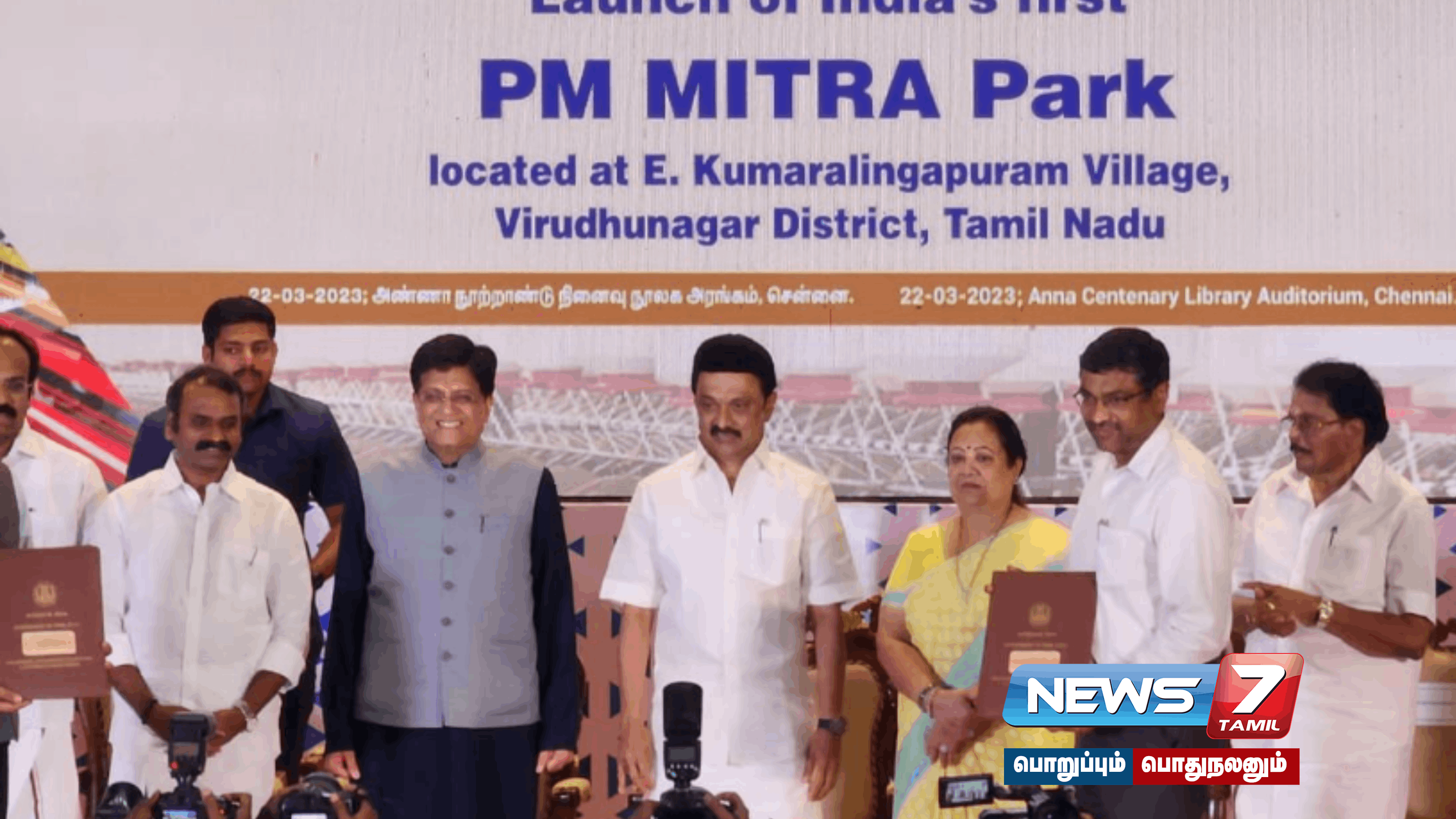 இந்தியா முழுவதும் தமிழ்நாடு, கர்நாடகா, மகாராஷ்டிரா, குஜராத், தெலுங்கானா, மத்தியபிரதேஷ் மற்றும் உத்தர பிரதேஷ் ஆகிய ஏழு மாநிலங்களில் மாபெரும் ஜவுளி பூங்கா தொடங்கப்பட உள்ளது. அதில் முதலாவதாக தமிழ்நாட்டின் விருதுநகர் மாவட்டம் இ.குமாரலிங்கபுரத்தில் அமைப்பதற்கான தொடக்க விழா சென்னை கோட்டூர்புரம் அண்ணா நூற்றாண்டு நூலகத்தில் நடைபெற்று வருகிறது. இந்நிகழ்ச்சியில் முதலமைச்சர் மு.க.ஸ்டாலின் ,மத்திய அமைச்சர் பியுஷ் கோயல் முன்னிலையில் மத்திய மாநில அரசுகளுக்கிடையே ஜவுளிப்பூங்காவுக்கான புரிந்துணர்வு ஒப்பந்தம் கையெழுத்தானது.