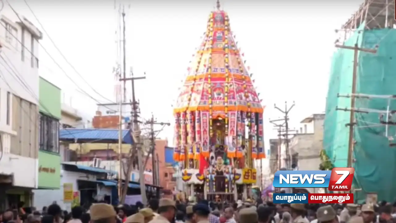 மேல ராஜவீதி தேரடி நிறுத்தத்தில் இருந்து மாவட்ட ஆட்சியர் பிரியங்கா பங்கஜம், அரண்மனை தேவஸ்தான பரம்பரை அறங்காவலர் பாபாஜி ராஜா பான்ஸ்லே, மாநகராட்சி மேயர் சன் ராமநாதன் உள்ளிட்டவர்கள் திருத் தேரினை வடம் பிடித்து இழுத்து துவக்கி வைத்தனர்.