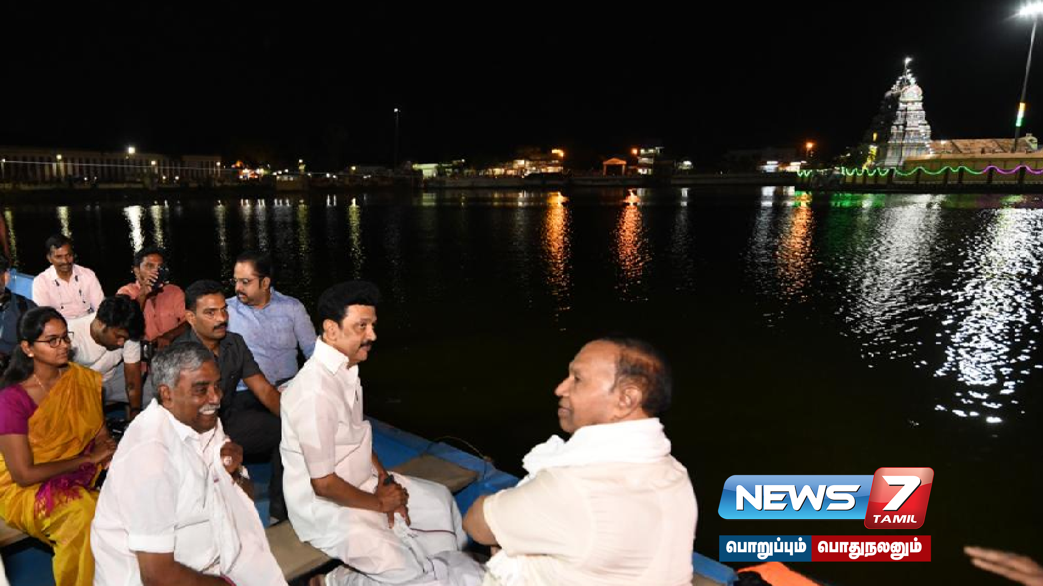 திருவாரூரில் சுற்றுப்பயணம் மேற்கொண்டுள்ள முதலமைச்சர் மு.க.ஸ்டாலின் கமலாலயம் குளத்தில் படகில் பயணம் செய்தார்.