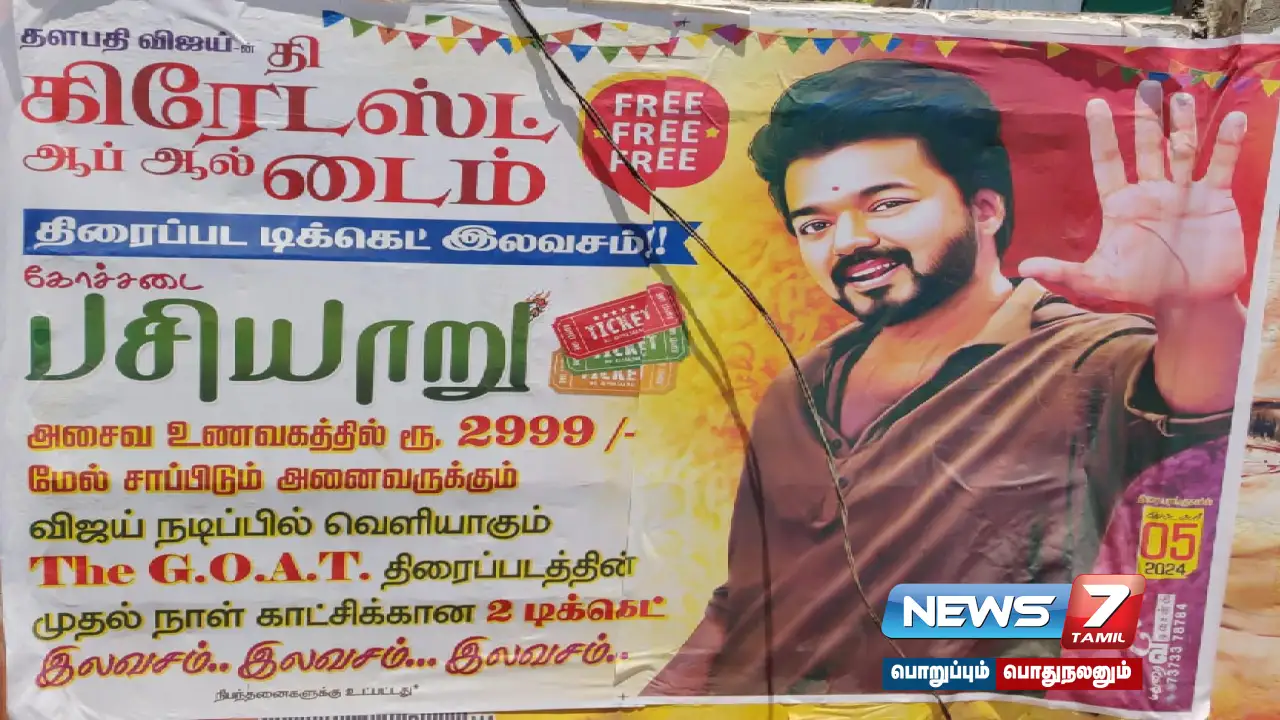 இந்நிலையில் ரூ.2999க்கும் மேல் உணவு சாப்பிட்டால், விஜய்யின் கோட் திரைப்படத்திற்கான இலவச டிக்கெட் வழங்கப்படும் என தனியார் உணவகம் ஒன்று போஸ்டர் ஒட்டியுள்ளது. மதுரை வில்லாபுரத்தில் இயங்கி வரும் கோச்சடை பசியாரு என்ற உணவகம், 2999 ரூபாய்க்கு மேல் அசைவ உணவு சாப்பிடுவோருக்கு, கோட் திரைப்படத்தின் முதல் காட்சிக்கான இரண்டு டிக்கெட்டுகள் வழங்கப்படும் அவனியாபுரம் சுற்று வட்டார பகுதிகளிலில் போஸ்டர்களை ஒட்டியுள்ளது.