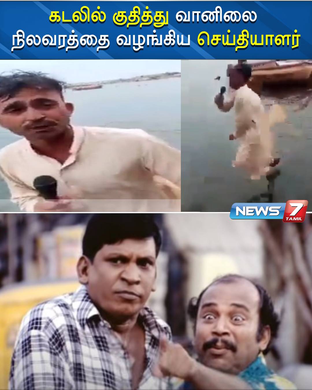 திடீரென கடலில் குதித்த அவர், தொடர்ந்து வானிலை நிலவரத்தை கூறிக்கொண்டே இருந்தார். இதுகுறித்த வீடியோ வெளியாகி லைக்குகளை குவித்து வருகிறது.