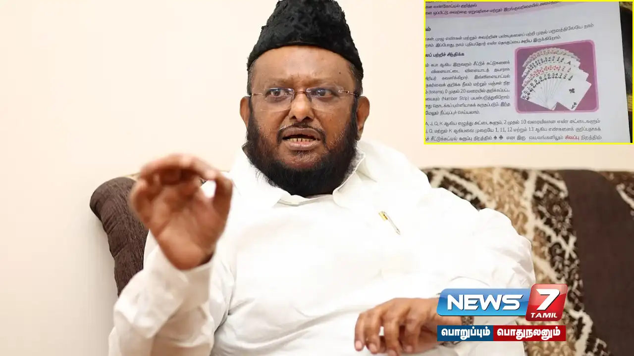ஆறாம் வகுப்பு கணக்கு பாடத்தில் உள்ள சீட்டு விளையாட்டு குறித்த தகவலை பள்ளிக் கல்வித்துறை நீக்க வேண்டும் என்று மனிதநேய மக்கள் கட்சியின் தலைவர் ஜவாஹிருல்லா கோரிக்கை விடுத்துள்ளார்.