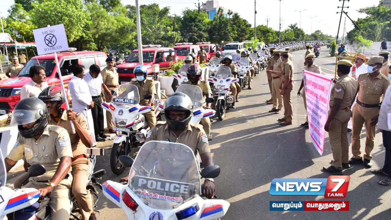 போதைபொருள் ஒழிப்பை வலியுறுத்தி திருச்சி நகர காவல்துறையினர் மோட்டார் சைக்கிள் பேரணி நடத்தி விழிப்புணர்வு ஏற்படுத்தினர்.