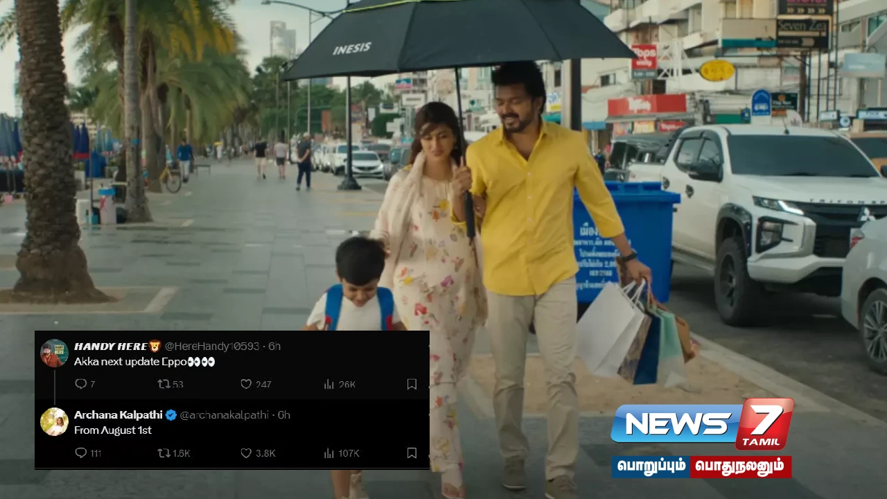 இதனிடையே எக்ஸ் தளத்தில், ” அடுத்த அப்டேட் எப்போது வெளியாகும்” என எக்ஸ் தள பயனர் ஒருவர் கேட்டிருந்தார். இந்நிலையில், திரைப்படத்தின் தயாரிப்பாளர் அர்ச்சனா கல்பாத்தி ஆகஸ்ட் 1 ஆம் தேதி ‘கோட்’ திரைப்படத்தின் அப்டேட் வெளியாகும் என தெரிவித்துள்ளார். இது, 3-வது பாடலின் அறிவிப்பாக இருக்கலாம் என எதிர்பார்க்கப்படுகிறது.