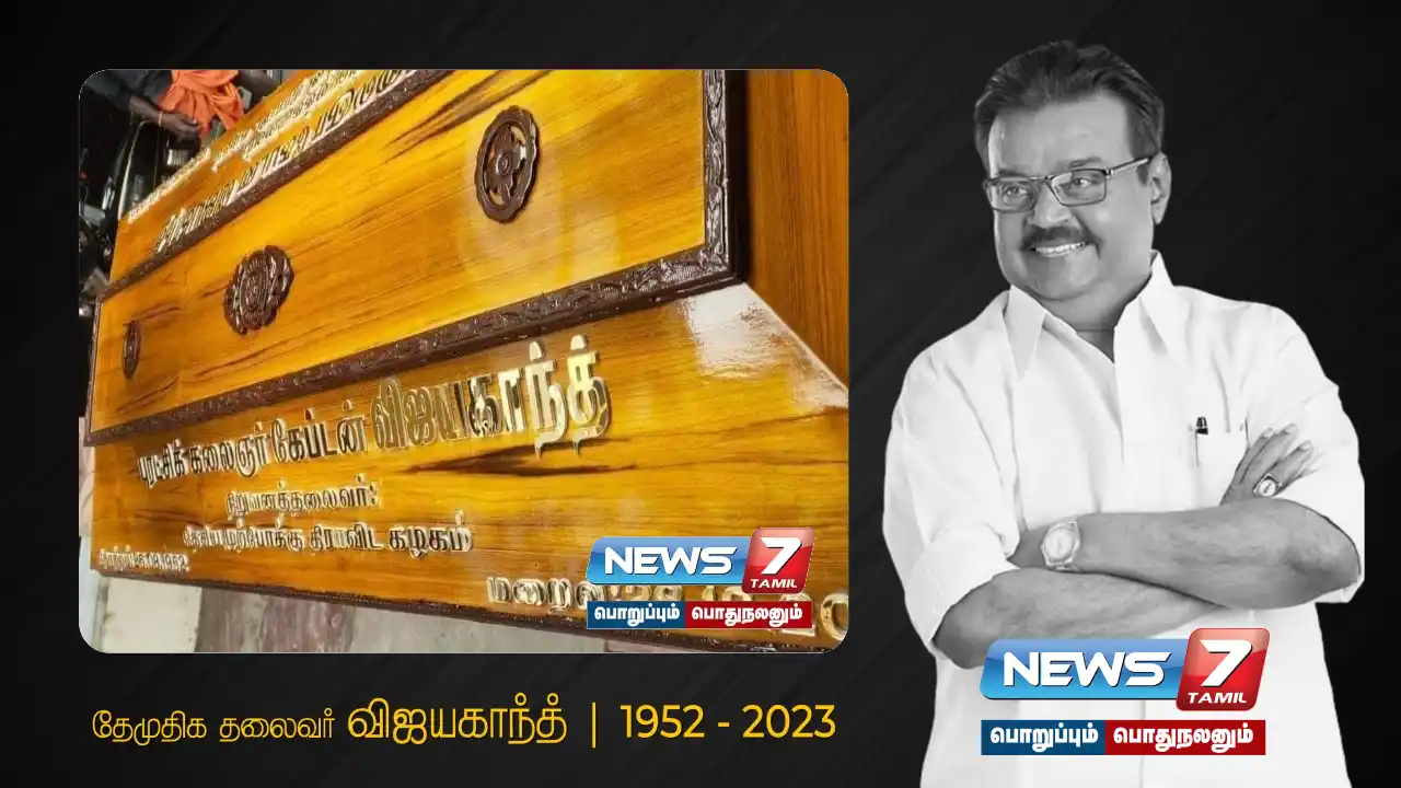 இந்நிலையில், விஜயகாந்த் உடலை சுமக்கவிருக்கும் சந்தனப் பேழையில், ‘புரட்சித் கலைஞர் கேப்டன் விஜயகாந்த்’ என்ற வாசகம் பொறிக்கப்பட்டுள்ளது. தேமுதிக தலைவர் என்றும், அதனுடன், அவரது பிறந்த தேதி மற்றும் மறைந்த தேதியும் இடம்பெற்றுள்ளது.