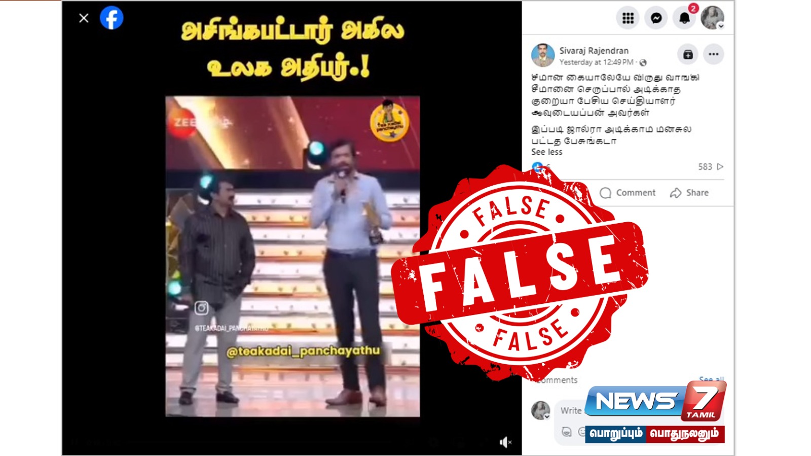 சீமான் கையாலேயே விருது வாங்கி, அவரையே அவமரியாதையாக பேசிய தனியார் தொலைக்காட்சி நெறியாளர் ஆவுடையப்பன் என்று ஒரு வீடியோ சமூக ஊடகங்களில் பகிரப்பட்டு வருகிறது. இது தொடர்பான உண்மைத் தன்மை குறித்து FactCrescendo ஆய்வு செய்தது. இது குறித்து விரிவாக காணலாம்.