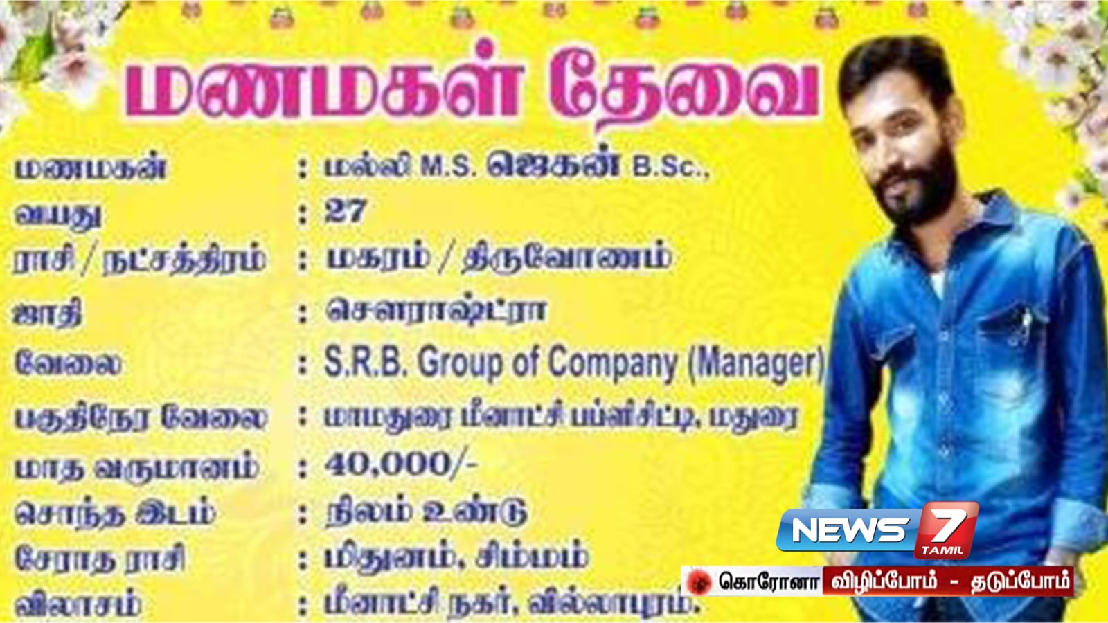 செய்தித்தாள்களில் விளம்பரம் செய்து மணமகள் தேடிய காலம் எல்லாம் மலையேறி வருகிறது. தற்போது இணையத்தில் மேட்ரிமோனியல் தளங்களையே பெரும்பாலானோர் விரும்புகின்றனர். இந்த நிலையில், மதுரையில் தனியார் நிறுவனத்தில் பணிபுரிந்து வரும் விழுப்புரத்தைச் சேர்ந்த இளைஞர் ஜெகன் என்பவர், மணமகள் தேவை என்ற போஸ்டரை வெளியிட்டார்.