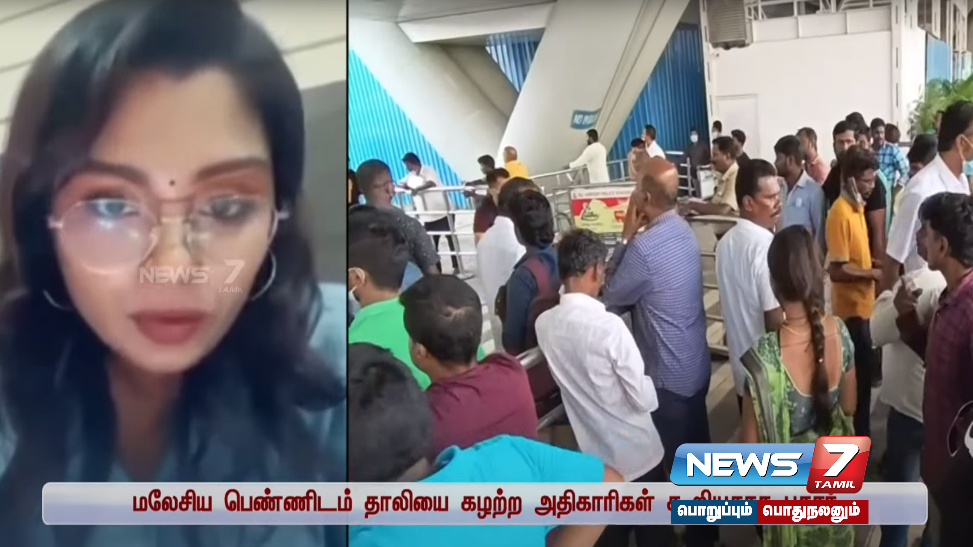 மலேசியாவில் இருந்து வந்த போது சென்னை விமான நிலையத்தில் தாலியை கழுற்ற சுங்க அதிகாரிகள் வற்புறுத்தியதாக பெண் ஒருவர் சமூக வலைதளத்தில் வீடியோ வெளியிட்டுள்ளார்.
