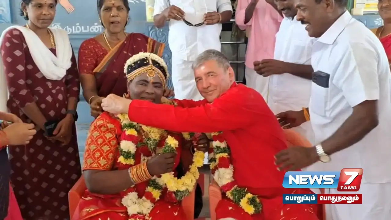 தொடர்ந்து தனது நண்பரான மார்க் அமலனின் சொந்த கிராமமான அ.விளாக்குளத்திற்கு வருகை தந்து, அமலனின் பெற்றோர்களின் உதவியுடன் மானாமதுரை அருகே தாயமங்களம் சாலையில் உள்ள நவத்தாவு அழகாபுரி நகர் முருகன் கோயிலில், தமிழர்களின் பாரம்பரிய முறைப்படி தாளி கட்டி, மாலை மாற்றி, மெட்டி அணிவித்து திருமணம் செய்துகொண்டனர்.