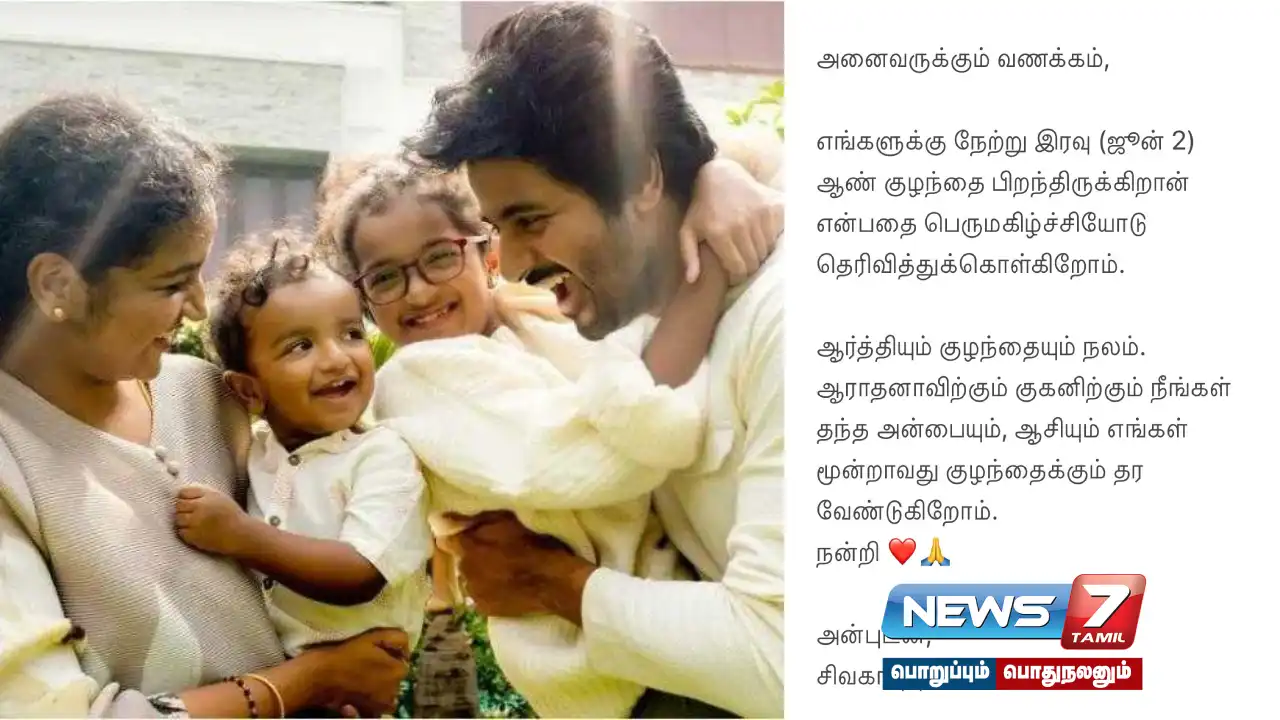 தமிழ் சினிமாவில் முன்னணி நடிகராக வலம் வரும் நடிகர் சிவகார்த்திகேயன் தனக்கு மூன்றாவது குழந்தை பிறந்துள்ளது என்ற செய்தியை சமூகவலைதளத்தில் பகிர்ந்துள்ளார். கடந்த சில நாட்களுக்கு முன்பு சிவகார்த்திகேயன் மனைவி ஆர்த்தி மூன்றாவது முறையாக கர்ப்பமாக உள்ளார் என்று அவர் பொதுவெளியில் பகிர்ந்த வீடியோ ஒன்று இணையத்தில் வைரலானது. அதை உறுதி செய்து நடிகர் சிவகார்த்திகேயன் மூன்றாவது குழந்தை பிறந்துள்ளதை அறிவித்துள்ளார்.