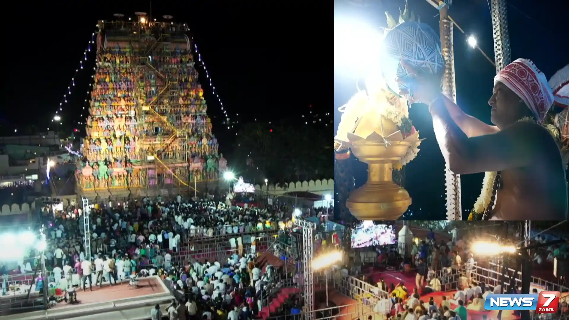 இந்நிலையில் இன்று அதிகாலை 8-ம் யாகசாலை பூஜை நடைபெற்றது. இதனை தொடர்ந்து மேள தாளங்கள் முழங்க யாகசாலையில் இருந்து தங்கம், வெள்ளி கடங்கள் புறப்பாடு நடைபெற்றது. தொடர்ந்து காலை 5.30 மணியளவில் 7 நிலை கொண்ட 125 அடி உயரமுள்ள ராஜகோபுரத்தில் அமைக்கப்பட்டுள்ள கலசங்கள் மீது புனித நீர் ஊற்றப்பட்டு மகா கும்பாபிஷேகம் நடைபெற்றது. தொடர்ந்து இராஜகோபுரங்களுக்கு தீபாராதனை காட்டப்பட்டது. அப்போது பக்தர்கள் அரோகரா கோஷம் எழுப்பி பரவசம் அடைந்தனர். இதேபோல் கோயிலின் கருவறையில் முருகப்பெருமான் திருக்கரத்தில் உள்ள தங்கவேலுக்கு மகா அபிஷேகம் நடைபெற்றது. கோபுர கலசத்தில் ஊற்றப்பட்ட புனிதநீர் பின்னர் டிரோன் மூலம் பக்தர்கள் மீதும் தெளிக்கப்பட்டது