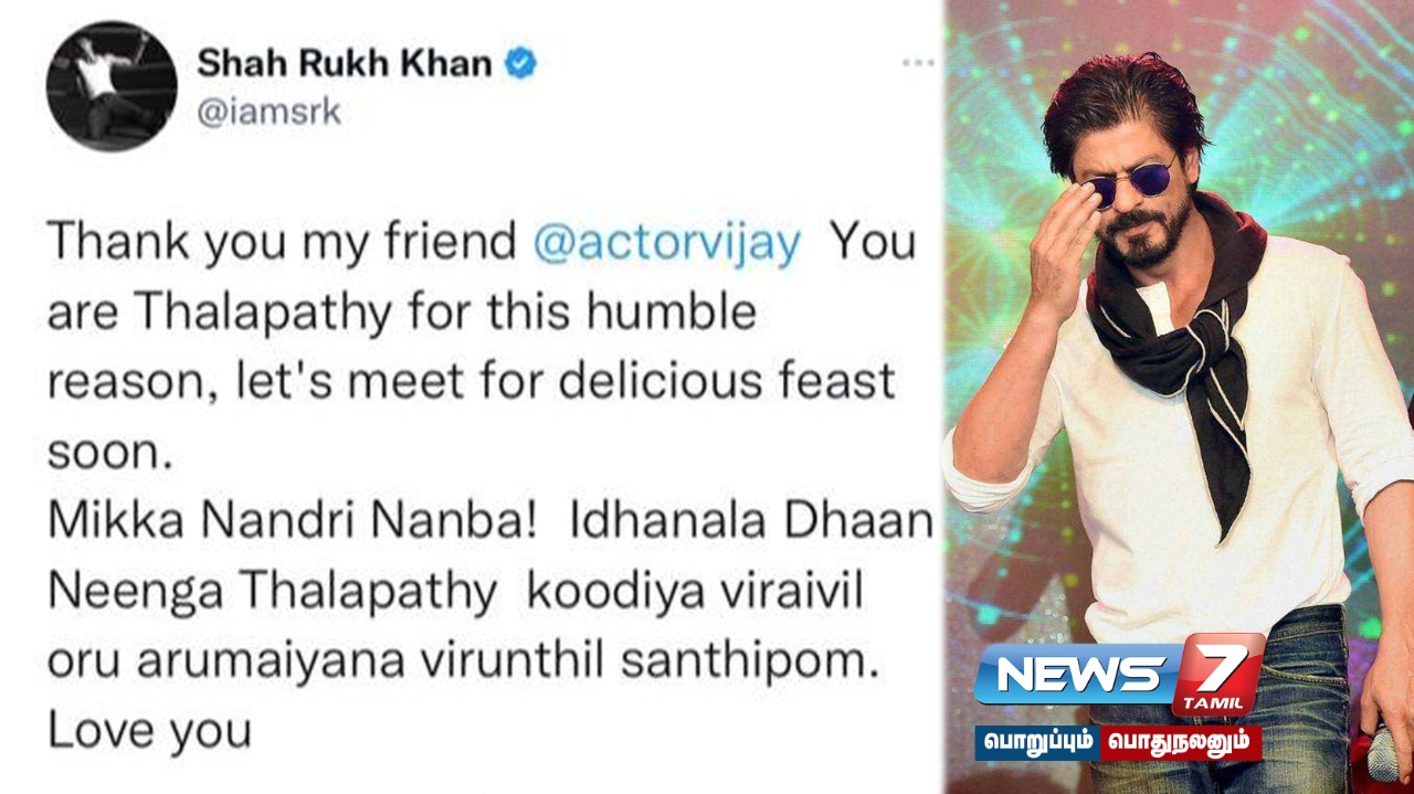 இதற்கு நன்றி தெரிவித்து நடிகர் ஷாருக் கான் தனது டிவிட்டர் பக்கத்தில் நடிகர் விஜய்யை புகழ்ந்து எழுதியுள்ளார். அவர் குறிப்பிட்டுள்ளதாவது..