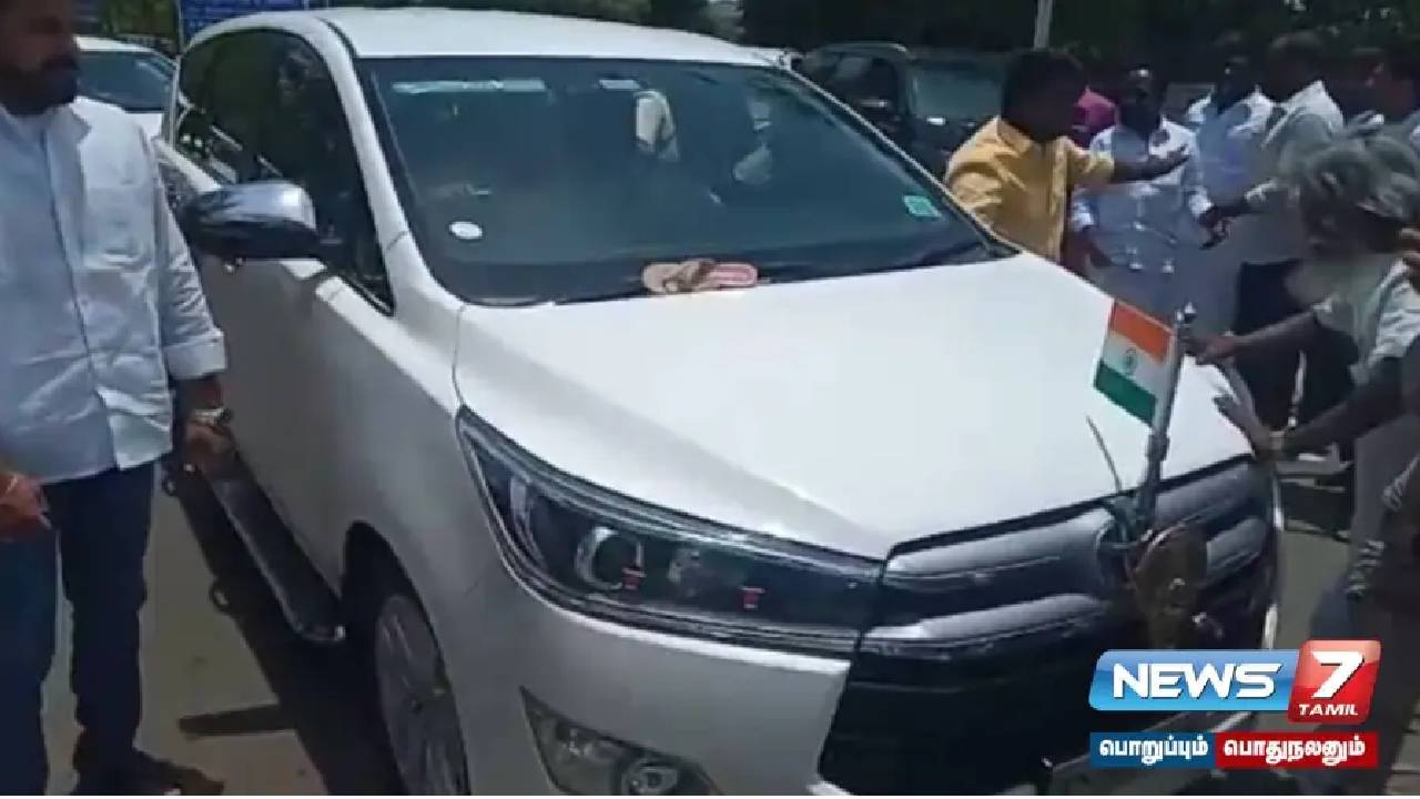 இருந்து வெளியே செல்லும்போது, அங்கு குவிந்திருந்த பாஜகவினர் திடீரென அவரது காரை மறித்து காலணியை தூக்கி வீசி அடாவடியில் ஈடுபட்டனர்.