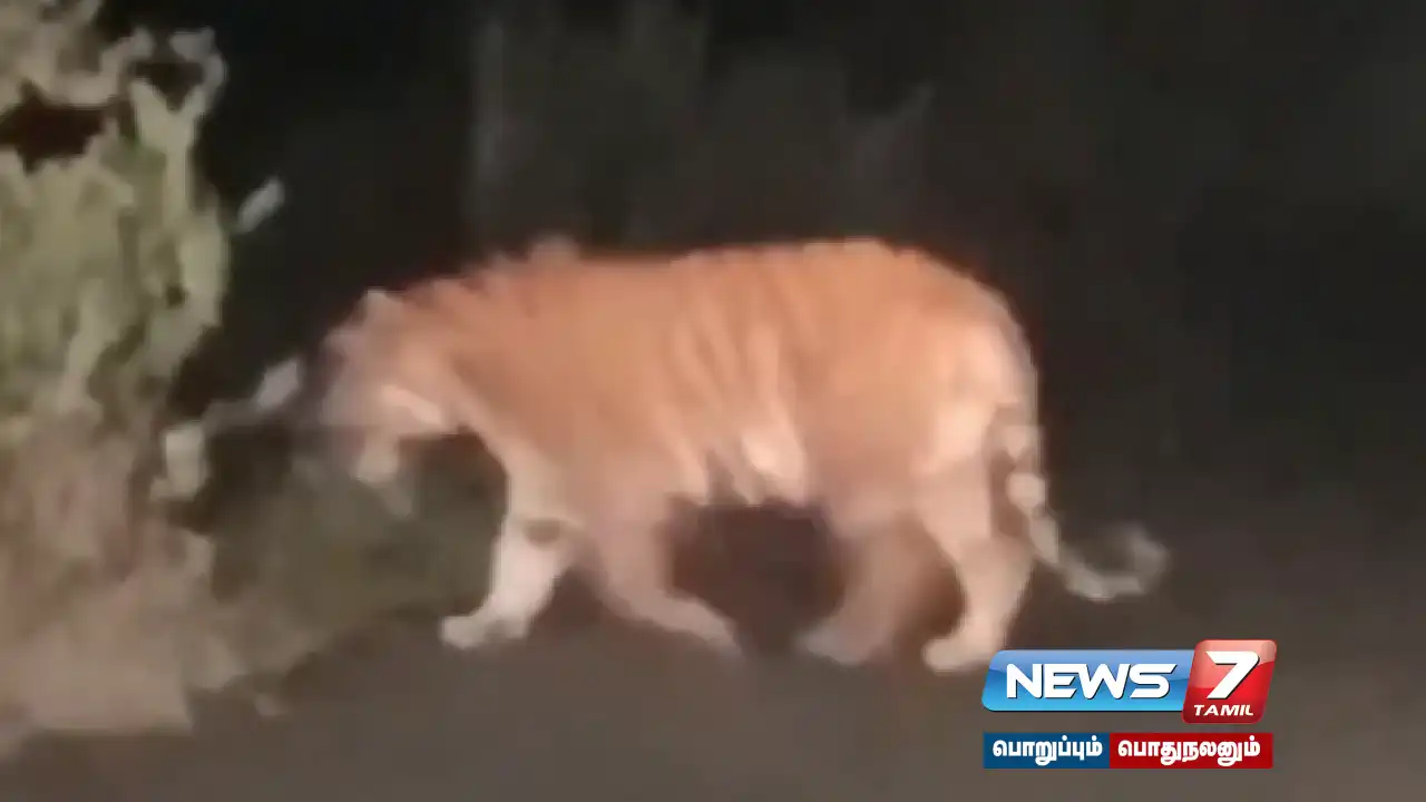 இந்நிலையில், நேற்று இரவு அந்த மலைபாதையில் புலி ஒன்று சாலையை கடந்து சென்றது. வனப்பகுதியில் உள்ள மலைப்பாதையை கடந்து வாகனங்களில் சென்று கொண்டிருந்த