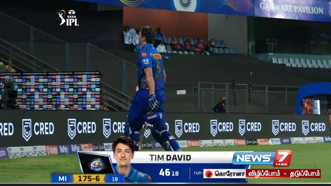 கேப்டன் ரோஹித் சர்மா 48 ரன்களும், விக்கெட் கீப்பர் இஷான் கிஷண் 43 ரன்களும் எடுத்து ஆட்டமிழந்தனர். மிடில் ஆர்டரில் களமிறங்கிய டிம் டேவிட் 46 ரன்கள் எடுத்தார். இவர் அணியை வெற்றிப் பாதைக்கு அழைத்துச் செல்வார் என்று எதிர்பார்க்கப்பட்ட நிலையில், எதிர்பாராதவிதமாக ரன் அவுட் ஆனார். பார்வையாளர்கள் அரங்கில் விளையாட்டை ரசித்து பார்த்துக் கொண்டிருந்த சாரா டெண்டுல்கர், டிம் டேவிட் ஆட்டமிழந்ததும் அதிர்ச்சி அடைந்தார். அவர் பெவிலியனுக்கு நடந்து சென்று கொண்டிருந்தபோது சாரா டெண்டுல்கரை நோக்கி மைதானத்தில் இருந்த கேமரா திரும்பியது. ரன் அவுட்டால் அவர் அதிர்ச்சியடைந்ததும் வீடியோவில் பதிவானது.