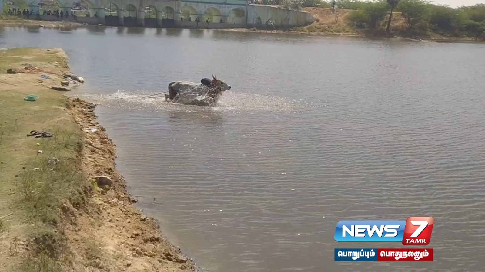 பின்னர் நீரில் திக்குமுக்காடி திணறியது. சுமார் ஒரு கிலோமீட்டர் சுற்றளவு கொண்ட கண்மாயில் காளை வெளியில் வர முடியாமல் தவித்த நிலையில் தண்ணீரில் மூழ்கி