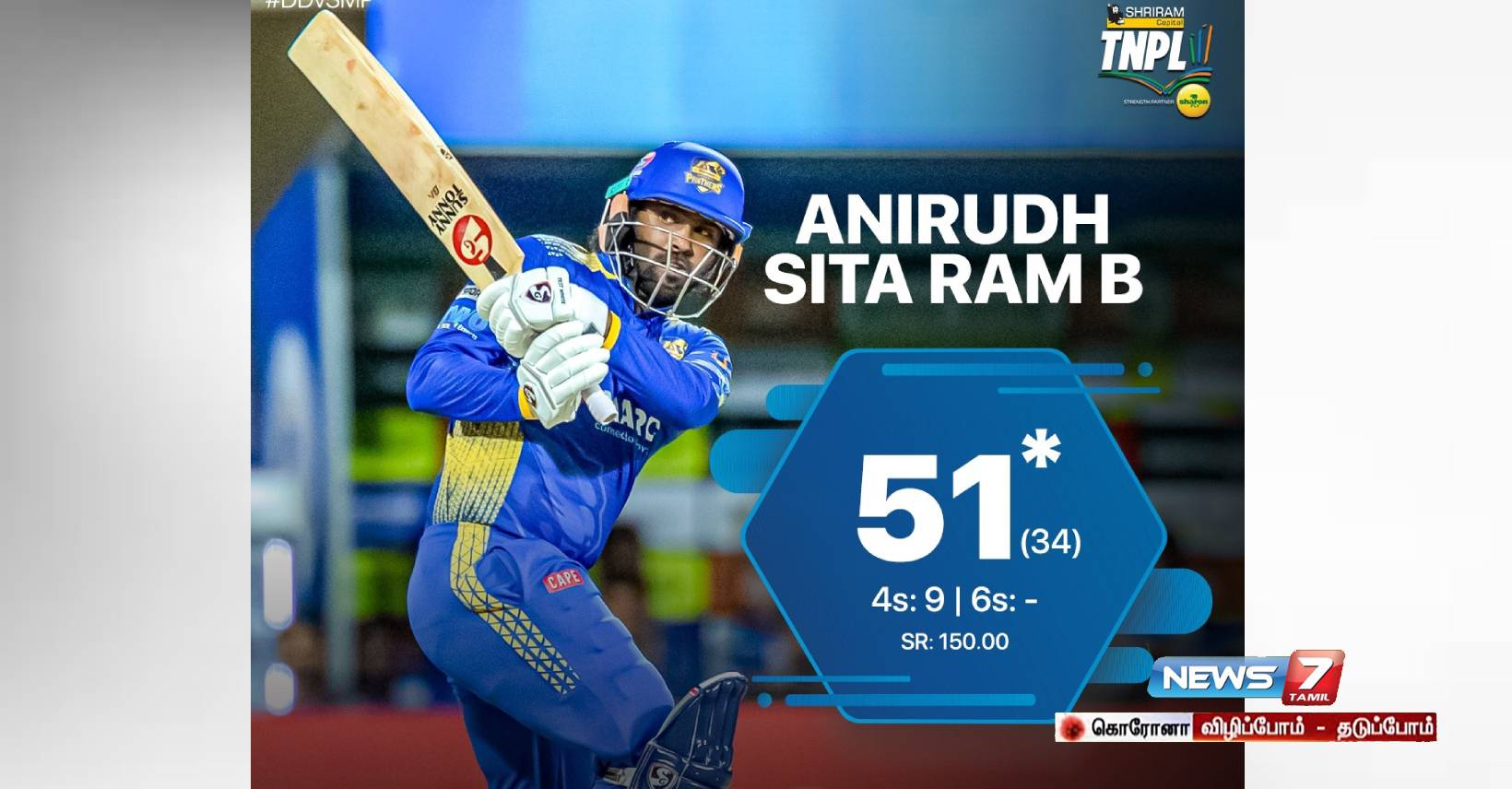 அந்த அணியின் தொடக்க ஆட்டக்காரர் அருண் கார்த்திக் 41 ரன்களிலும், விக்னேஷ் ஐயர் 11 ரன்களிலும் ஆட்டமிழந்தனர். பாலசந்தர் அனிருத், அரை சதம் பதிவு செய்து கடைசி வரை ஆட்டமிழக்காமல் களத்தில் இருந்தார். கேப்டன் சதுர்வேத் 10 ரன்கள் எடுத்து ஆட்டமிழந்தார்.