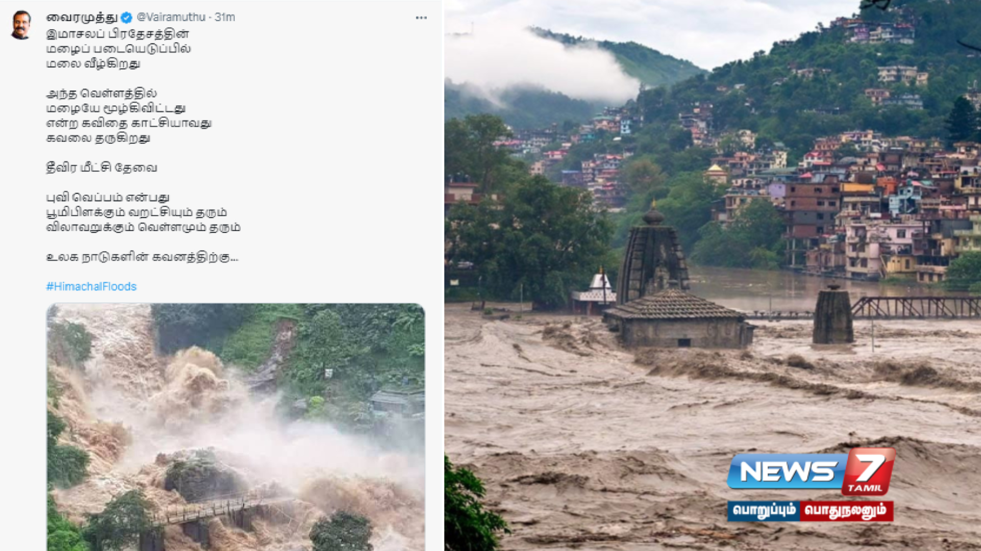 இமாச்சலப்பிரதேசத்தின் வெள்ளம் குறித்து கவிப்பேரரசு வைரமுத்து ட்விட்டரில் கவிதை ஒன்றை பதிவேற்றியுள்ளார்.