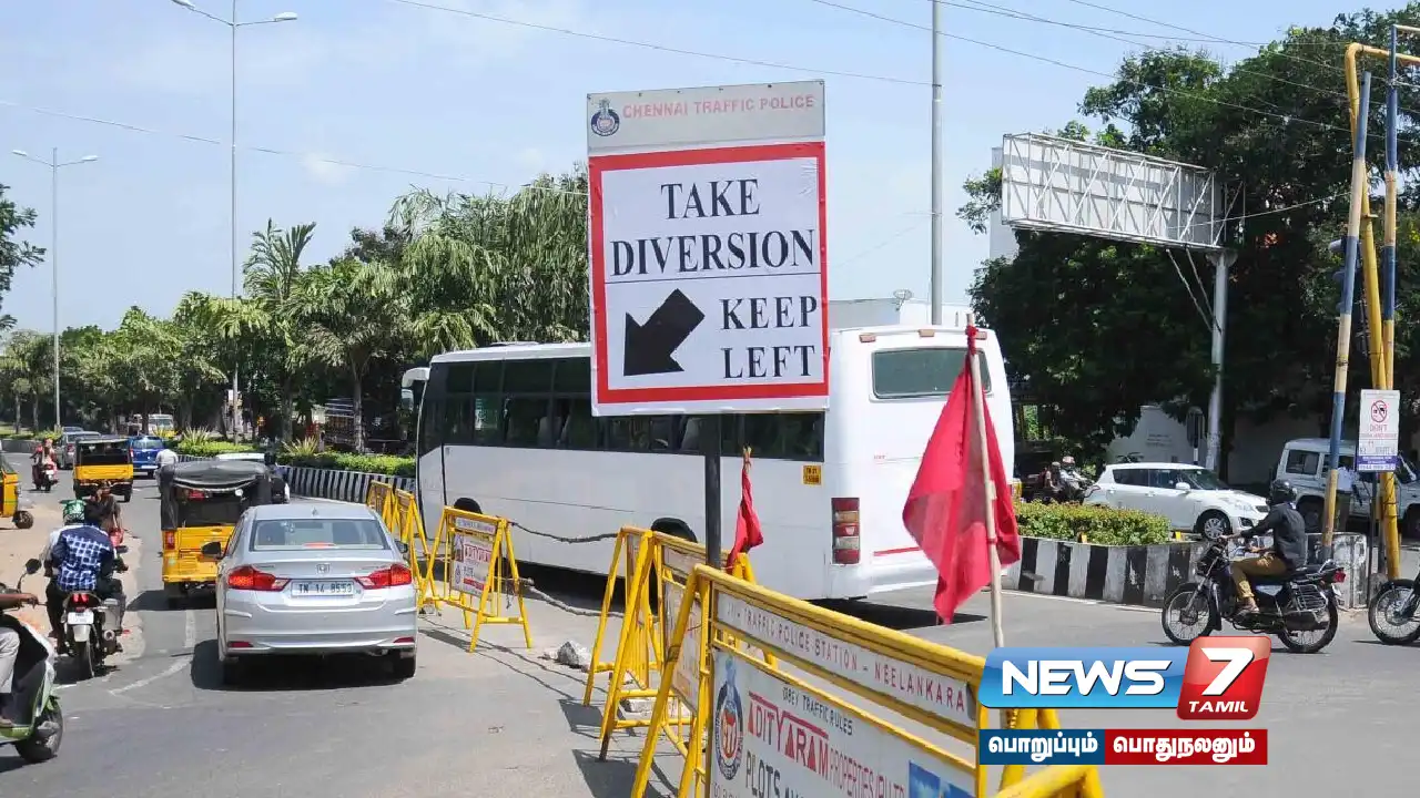 2). MRTS X R.K.SalaiJn ஐத் தாண்டி காந்தி சிலைக்கு எந்த வாகனமும் அனுமதிக்கப்படாது. காவலரின் நீர்த்தார் நினைவு நாள் அணிவகுப்பு நேரத்தில், மாற்று வழியாக அந்த வாகனங்கள் லைட் ஹவுஸ் MRTS சாலை வழியாக சென்று லாயிட்ஸ் சாலை காமராஜர்சாலை வழியாக சென்று தங்கள் இலக்கை அடையலாம்.