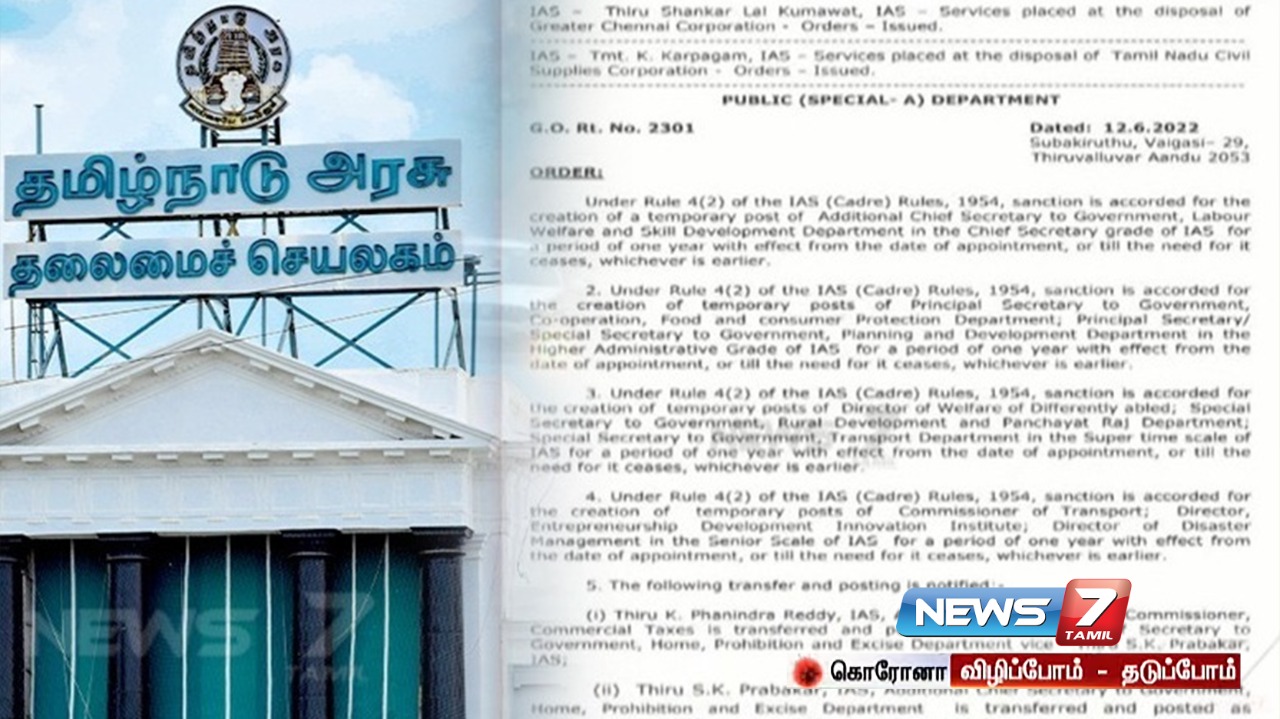 மேலும், 2 ஆண்டுகளில் 27 மாவட்ட ஊரக உள்ளாட்சி அமைப்புகளின் பதவிக்காலம் முடிவடையும் நிலையில், மாநில தேர்தல் ஆணையத்துக்கு புதிய செயலாளர் நியமனம் செய்யப்பட்டுள்ளார். மாற்றுத்திறனாளிகள் நலத்துறைச்செயலாளராக ஆனந்தகுமாரும், ஊரக வளர்ச்சித்துறைச்செயலாளராக தரேஸ் அகமதுவும், புவியிய & சுரங்கத்துறை ஆணையராக ஜெயகாந்தனும் நியமிக்கப்பட்டுள்ளார்.