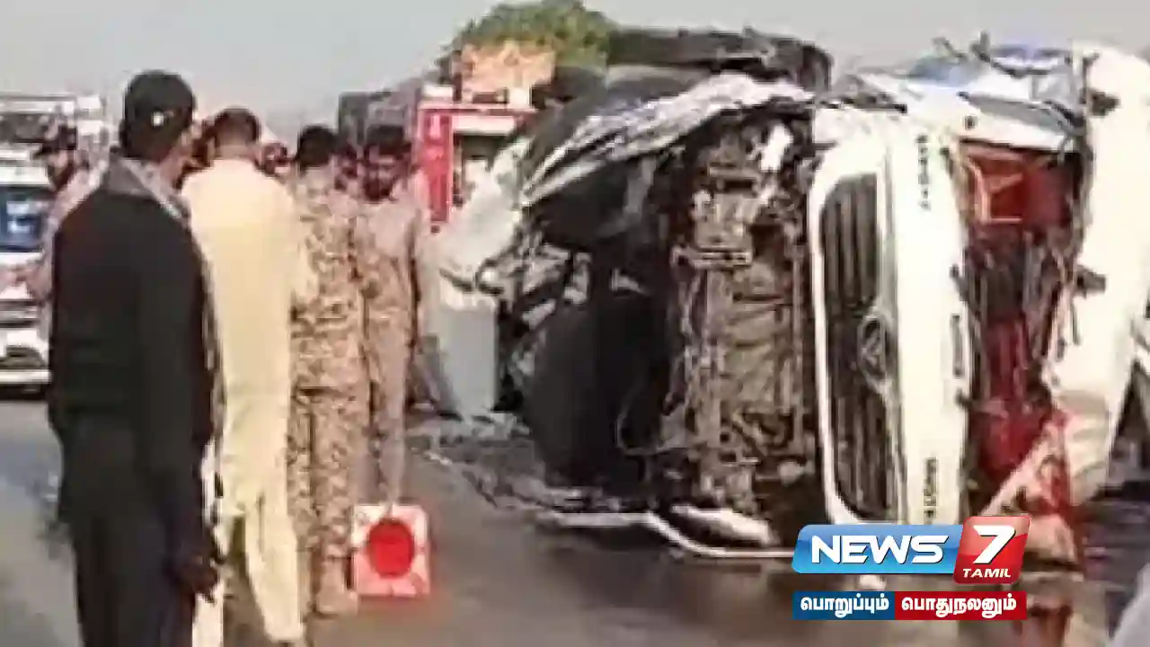 பாகிஸ்தான் மாவட்டம், சிந்து மாகாணத்தில் கராச்சி அருகே M9 நெடுஞ்சாலையில் பயணிகளை ஏற்றிச் கொண்டு பேருந்து ஒன்று சென்றுள்ளது. அப்போது எதிரே வந்த எண்ணெய் லாரியும், பேருந்தும் நேருக்கு நேர் மோதி விபத்துக்குள்ளாகியது.