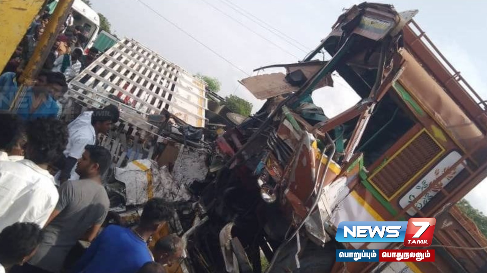 பழனி அருகே செங்கல் லாரியும் – தேங்காய் லாரியும் மோதிய விபத்தில் இருவர்