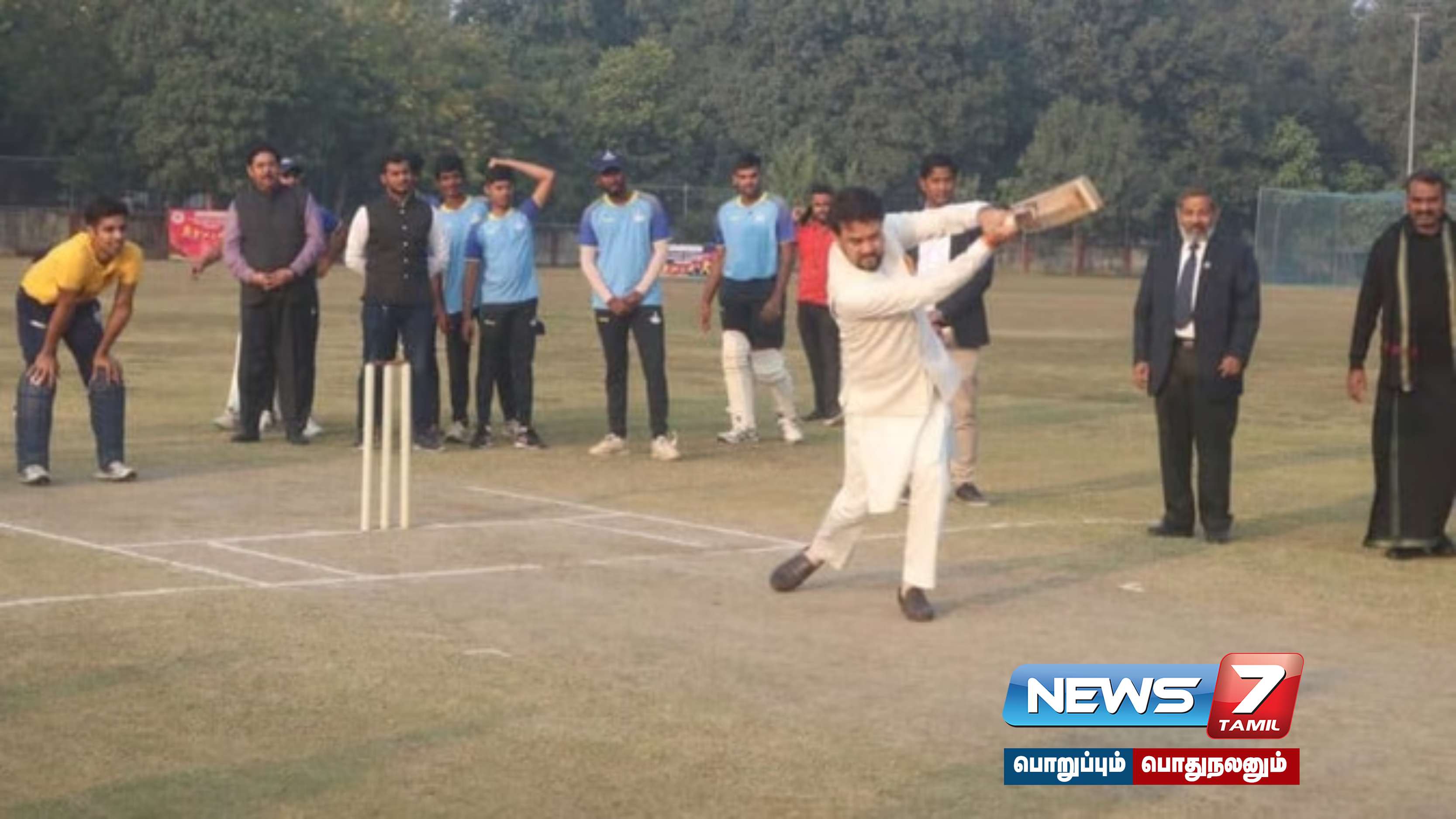 உத்தரப்பிரதேசம் – தமிழ்நாடு இடையே நட்பு ரீதியிலான கிரிக்கெட் போட்டி நடைபெற்றது. அப்போது வீரர்களை வரவேற்ற மத்திய அமைச்சர் அனுராக் தாக்கூர், மைதானத்தில் கிரிக்கெட் விளையாடினார்.