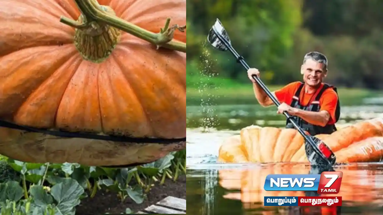 அமெரிக்காவை சேர்ந்த கேரி கிறிஸ்டன்சென் என்பவர் பெரிய பூசணிக்காயை படகாக பயன்படுத்தி பயணம் செய்து உலக சாதனை படைத்துள்ளார்.