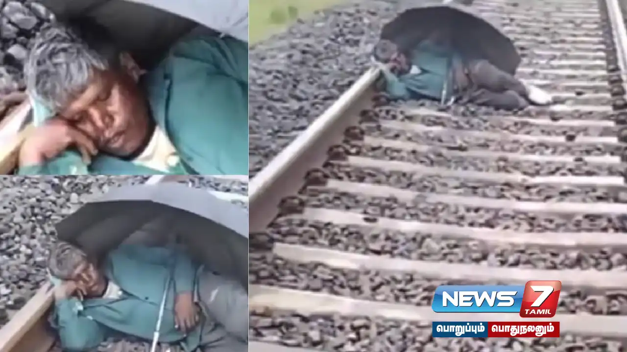 உத்தரப்பிரதேசம்: ரயில்வே டிராக்கில் குடை பிடித்தபடி அசந்து தூங்கிய நபர்;