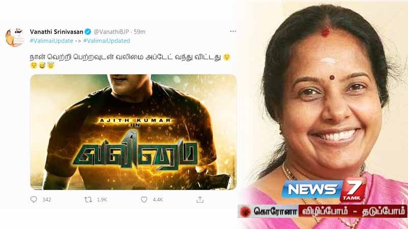 தான் வெற்றி பெற்றவுடன் வலிமை அப்டேட் வந்துவிட்டதாக பாஜக எம்எல்ஏ வானதி சீனிவாசன் தனது ட்விட்டர் பக்கத்தில் தெரிவித்துள்ளார்.