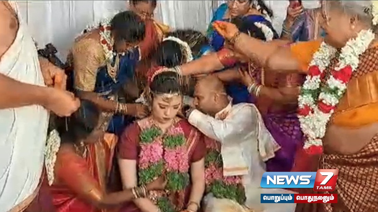 இந்த நிலையில், இன்று காலை வாணியம்பாடி அடுத்த கிரிசமுத்திரம் பகுதியில் உள்ள தனியார் திருமண மண்டபத்தில் தென் கொரியாவை சேர்ந்த இளம் பெண் மற்றும் தமிழகத்தை சேர்ந்த இளைஞருக்கும், உறவினர்கள் இந்து முறைப்படி திருமணம் நடத்தி வைத்தனர். திருமணத்தில் உறவினர்கள் நண்பர்கள் என ஏராளமான கலந்து கொண்டு மணமகன் மற்றும் மணமகளுக்கு வாழ்த்துகளை தெரிவித்தனர்.