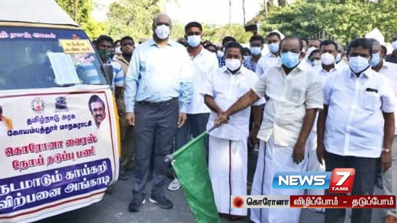 தளர்வற்ற முழு ஊரடங்கையொட்டி, கோவையில் நடமாடும் காய்காறி வாகனங்களை, உணவுத்துறை அமைச்சர் சக்கரபாணி மற்றும் வனத்துறை அமைச்சர் ராமசந்திரன் துவக்கி வைத்தனர்.
