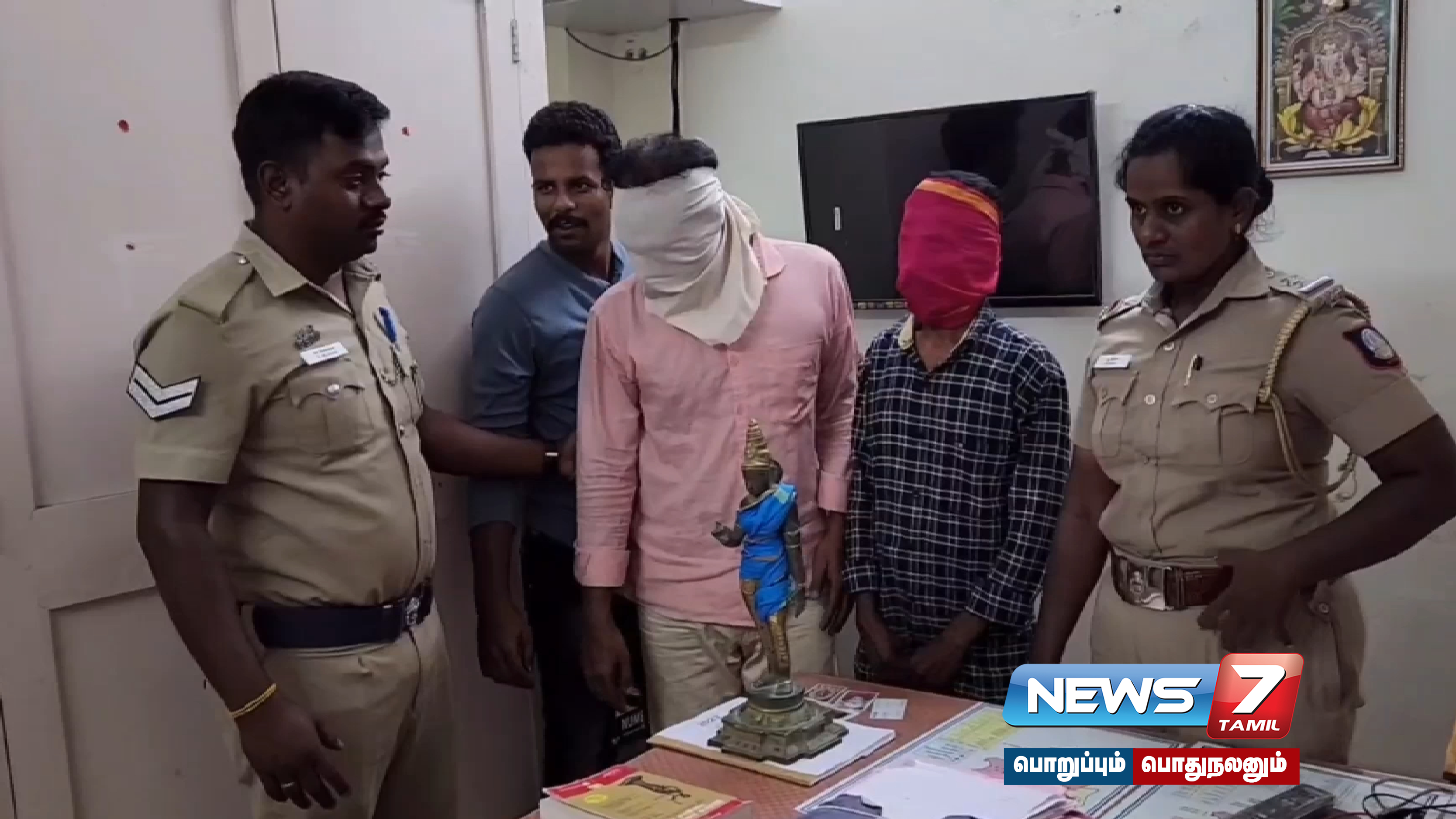 அவர்கள் வைத்திருந்த கட்டைப்பையை சோதனை செய்த போது அதிலிருந்து கருவேப்பிலைகளுக்கு இடையில் சுமார் ஒன்றரை அடி உயரமும், ஐந்தரை கிலோ எடையும் உடைய சிவகாமி அம்மையாரின் ஐம்பொன் சிலை பறிமுதல் செய்யப்பட்டது.சிலையை கடத்தி வந்த திருவண்ணாமலை மாவட்டத்தை சேர்ந்த வின்சென்ட் ராஜ்(43), கண்ணன் (42) ஆகிய இருவரை கைது செய்த போலீசார், அவர்களிடம் இருந்து கடத்தலுக்கு பயன்படுத்திய ஒரு இருசக்கர வாகனம் மற்றும் மூன்று செல்போன்களை பறிமுதல் செய்தனர்.