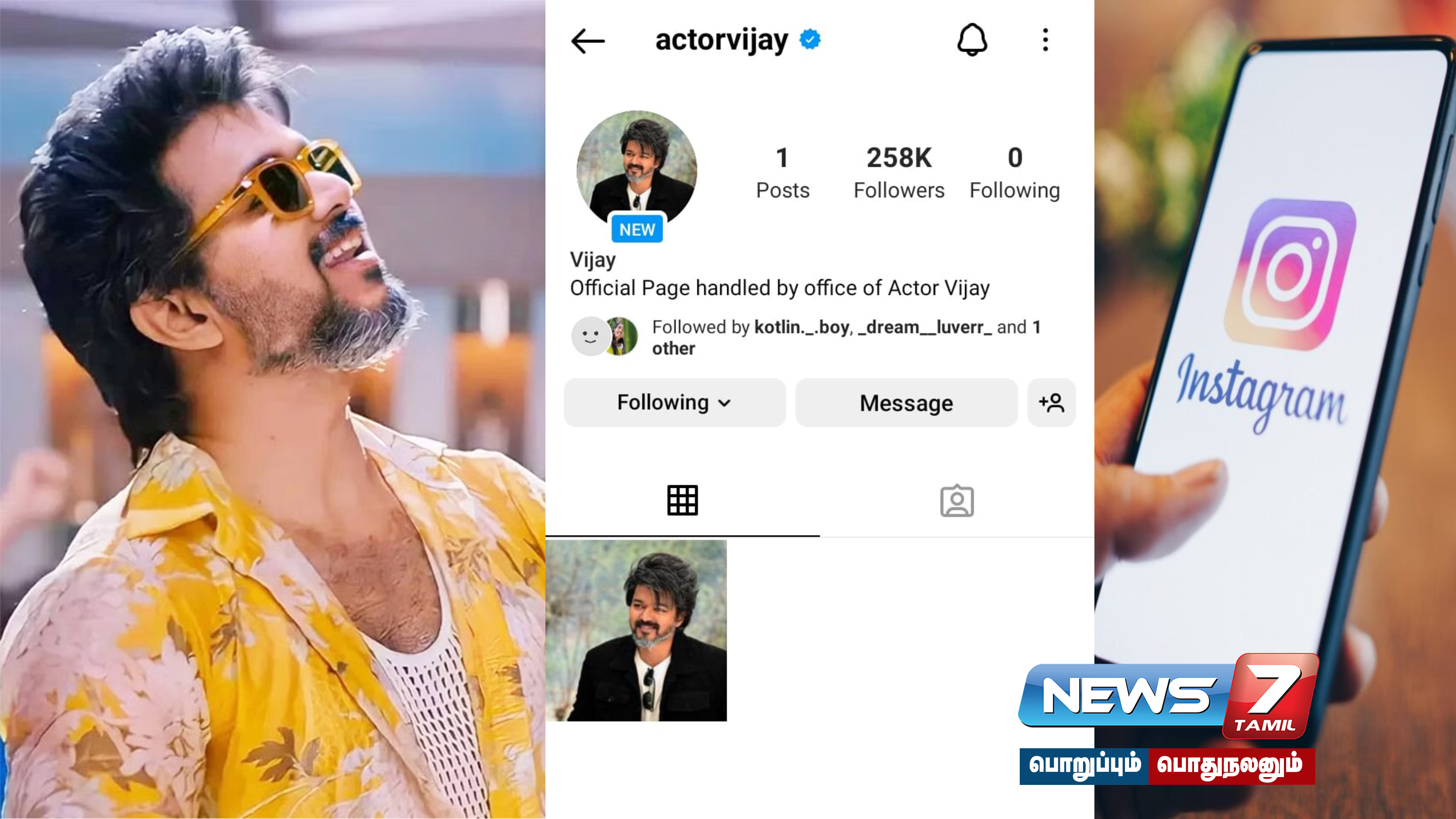 இந்நிலையில், ட்விட்டர், ஃபேஸ்புக்கை தொடர்ந்து இன்ஸ்டாகிராமில் விஜய் கணக்கு தொடங்கியுள்ளார். விஜய்-ன் அதிகாரப்பூர்வ இந்த கணக்கை ஏராளமானோர் பின்தொடர்ந்து வருகின்றனர். நொடிக்கு 1000 பேர் பின்தொடர்கின்றனர். தொடங்கிய அரை மணி நேரத்தில் 3 லட்சத்திற்கும் அதிகமானோர் பின்தொடர்ந்துள்ள நிலையில், இந்த எண்ணிக்கை தொடர்ந்து அதிகரித்து வருகிறது.