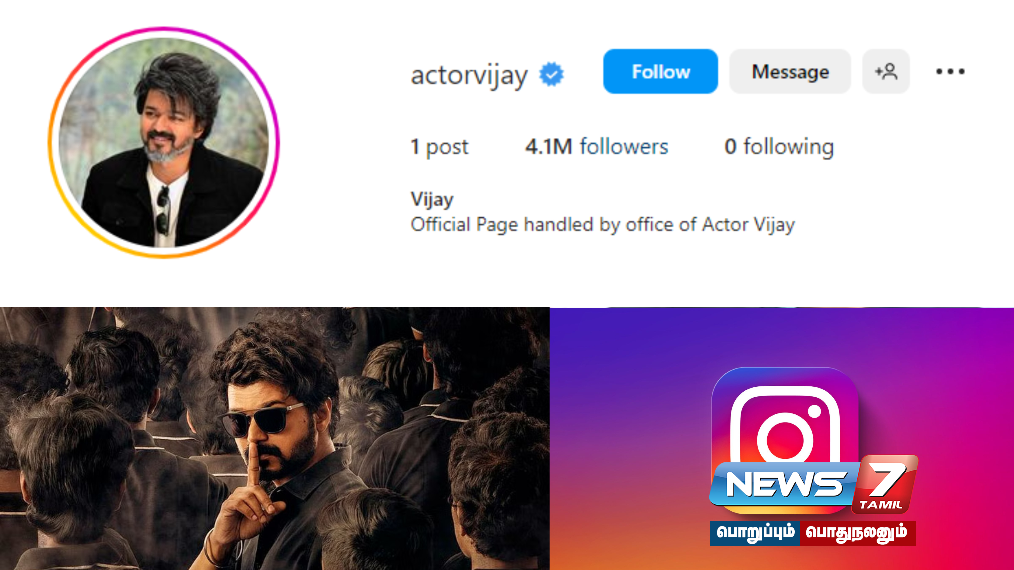 இன்ஸ்டாகிராம் பக்கத்தை தொடங்கிய 99 நிமிடங்களில் 10 லட்சம் ஃபாலோவர்ஸை கடந்த நடிகர் விஜய், உலகளவில் மிக விரைவாக 10 லட்சம் ஃபாலோவர்ஸை பெற்றவர்களின் பட்டியலில் மூன்றாம் இடம் பிடித்து அசத்தியுள்ளார்.