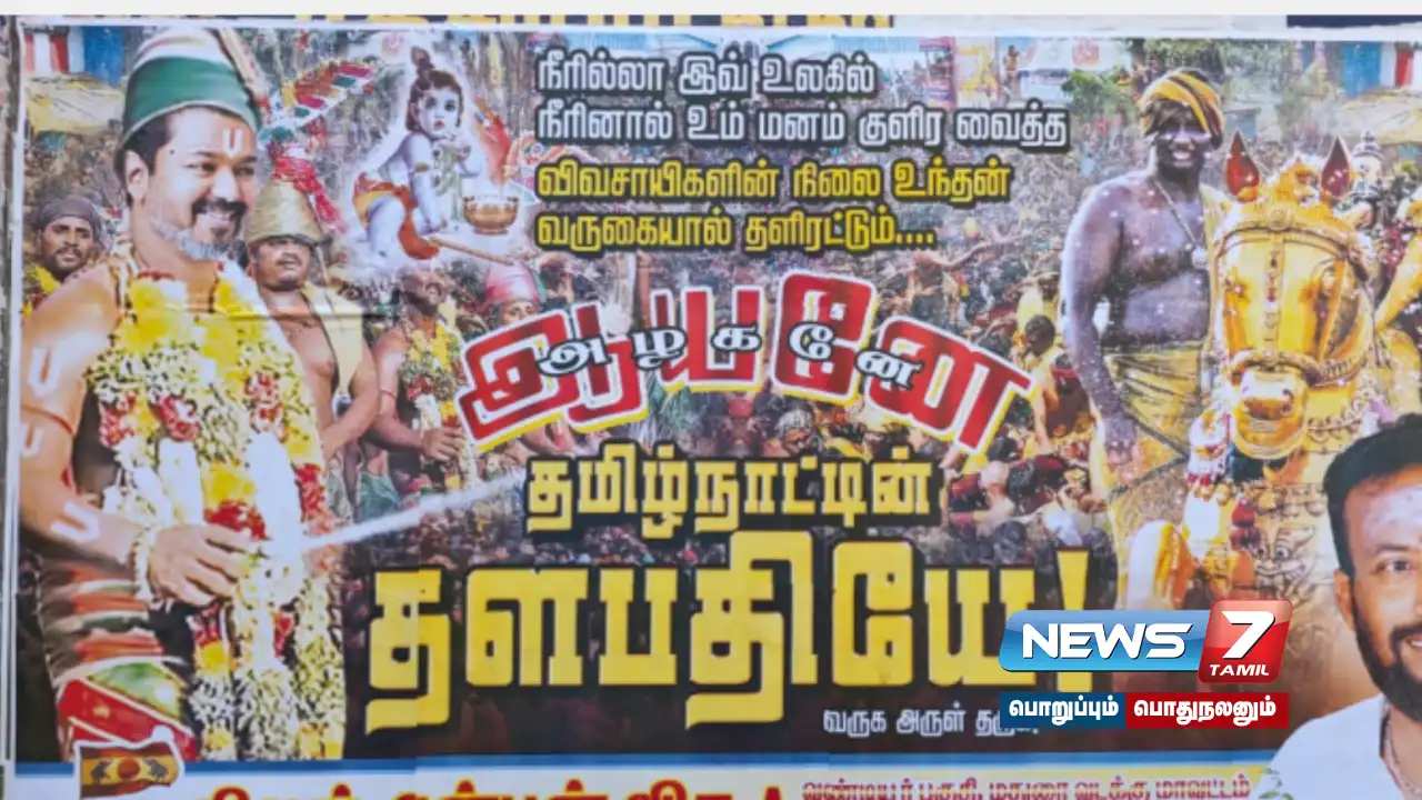 நடிகர் விஜய் கள்ளழகர் வேடமிட்டபடி, தலையில் தலைப்பாகையுடன், உடல் முழுவதும் நாமம் பூசிய படி கையில் தண்ணீர் தோப்பரை வைத்தபடி உள்ள படத்துடன் பதிவிட்டு, விவசாயிகளின் நிலை உந்தன் வருகையால் தளிரட்டும் என்ற வாசகத்தோடு, தமிழ்நாட்டின் தளபதியே என்ற அடுக்கு மொழி வசனத்தோடு சுவரொட்டிகளை ஆங்காங்கே ஒட்டியுள்ளனர்.