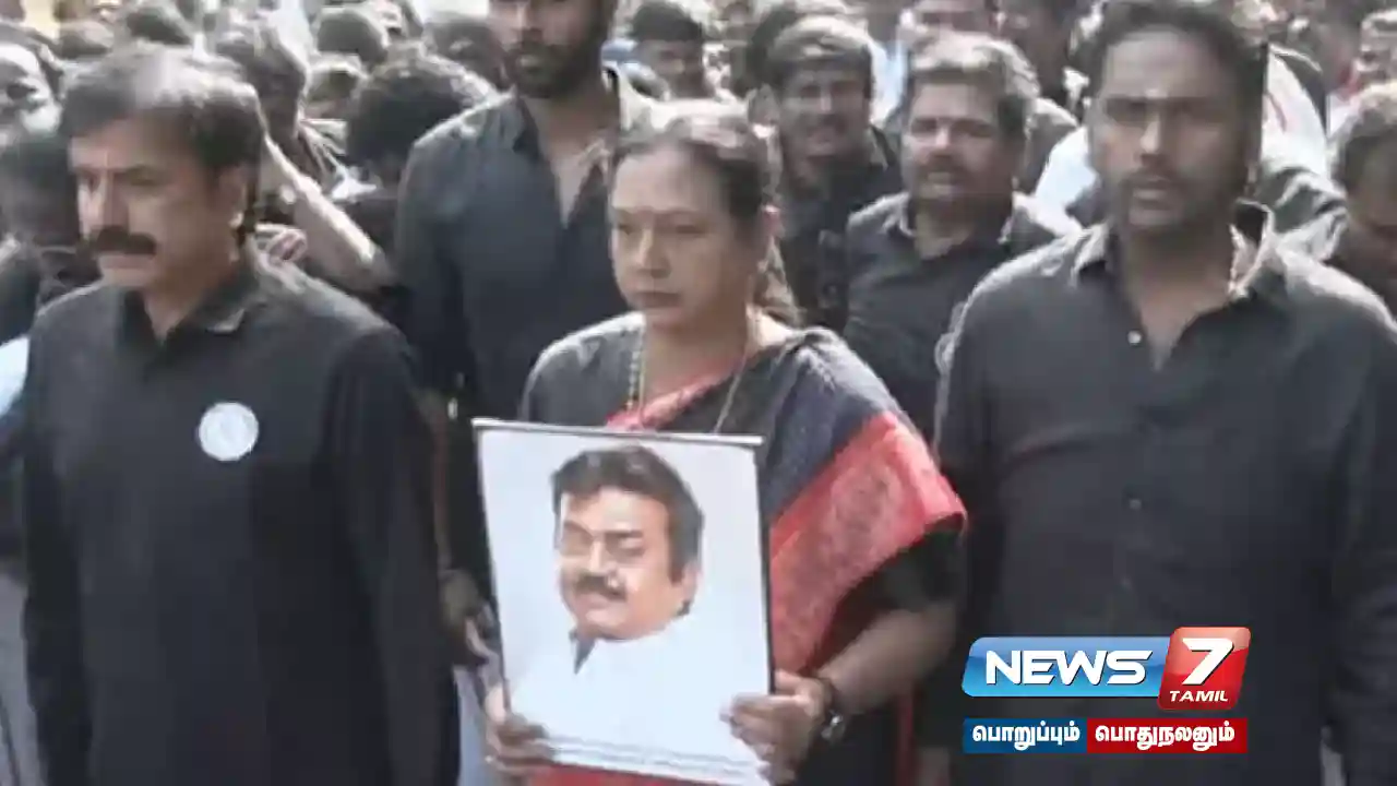 இதனை தொடர்ந்து, சென்னை கோயம்பேட்டில் தேமுதிகவினர் பேரணி நடத்தினர். பிரேமலதா விஜயகாந்த் தலைமையில் மாநில தேர்தல் ஆணையத்தில் இருந்து விஜயகாந்த் நினைவிடம் நோக்கி பேரணி நடைபெற்றது. இதில் விஜயகாந்த் மகன் விஜய பிரபாகரன், சுதீஷ் மற்றும் நூற்றுக்கணக்கான மக்கள், தேமுதிக தொண்டர்கள் பங்கேற்றனர். பேரணியாக வந்து விஜயகாந்த் நினைவிடத்தில் பொதுச்செயலாளர் பிரேமலதா அஞ்சலி செலுத்தினர்.