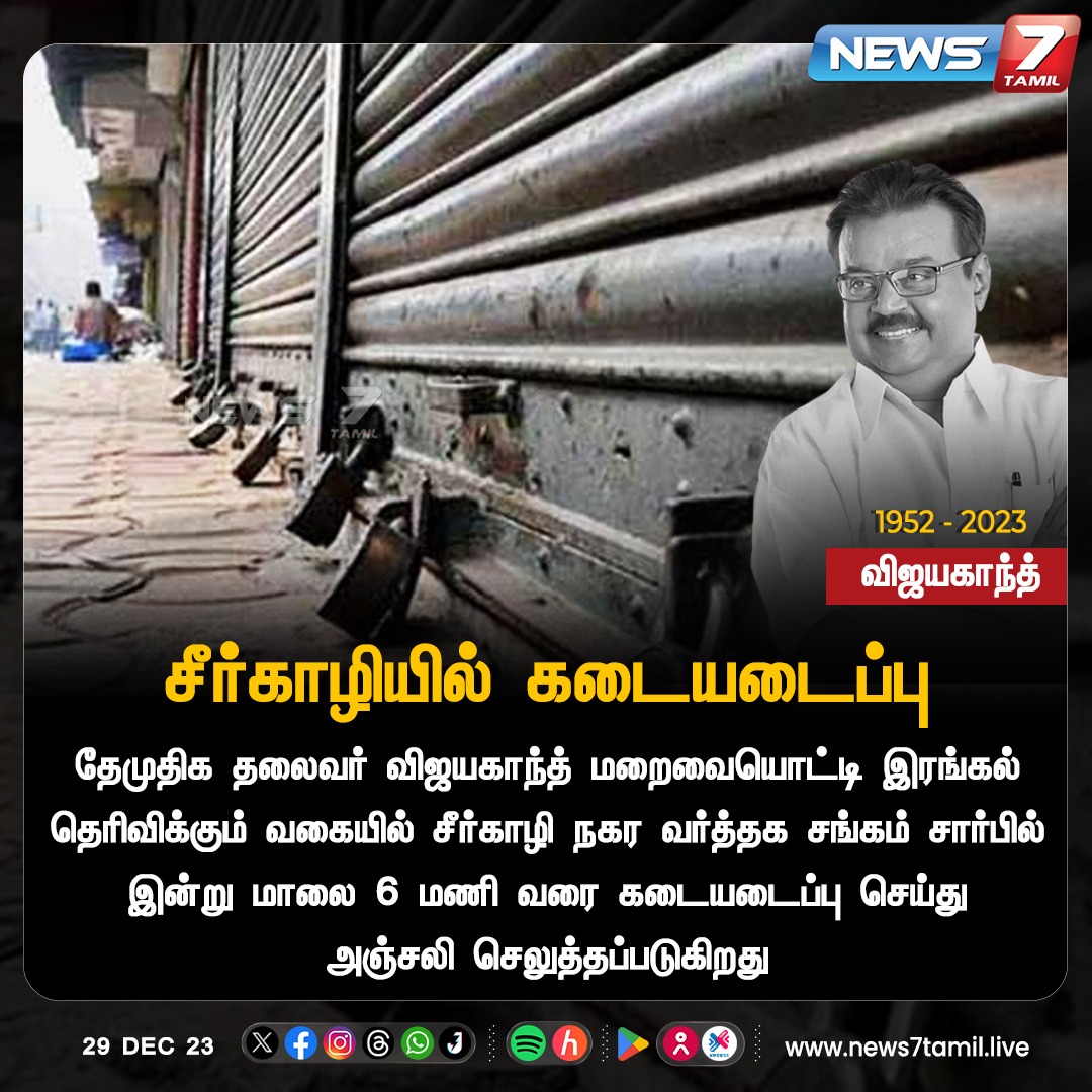 தேமுதிக தலைவர் விஜயகாந்த் மறைவையொட்டி இரங்கல் தெரிவிக்கும் வகையில் சீர்காழி நகர வர்த்தக சங்கம் சார்பில் இன்று மாலை 6 மணி வரை கடையடைப்பு செய்து அஞ்சலி செலுத்தப்படுகிறது. அதேபோல தஞ்சை மாவட்டம் ஆடுதுறையில் பகல் 12.00 மணி முதல் மாலை 6.00 மணி வரை கடைகள் அடைத்து வணிகர்கள் தங்களது இரங்கலை தெரிவிக்கின்றனர்.