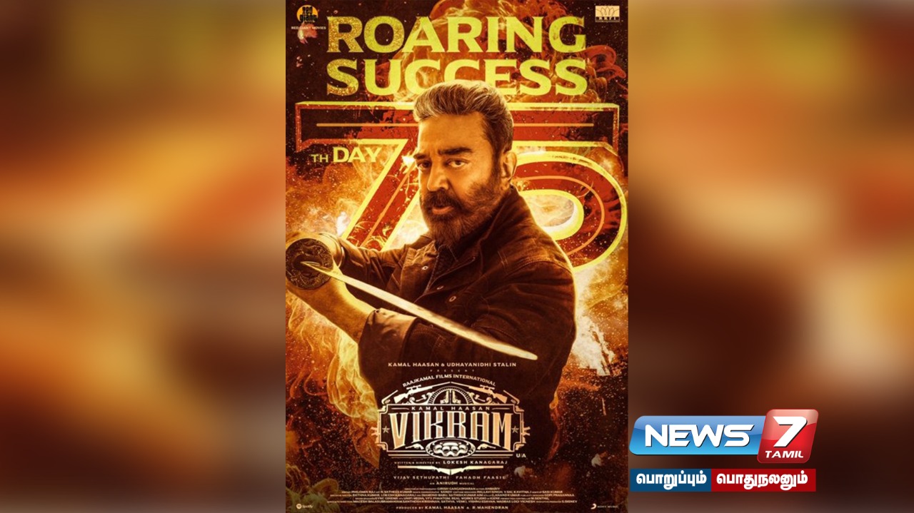 இதுவரை தமிழ் திரைத்துறையின் வசூல் சாதனைகள் அனைத்தையும் முறியடித்து கமலுக்கு தமிழ் திரையுலகிற்கு கம் பேக் கொடுத்தார். மேலும் படம் வெளியாகிய அடுத்த மாதமே ஓடிடியில் இப்படம் வெளியாகினாலும், இன்னும் பல திரையரங்கங்களில் ஓடிக்கொண்டிருக்கிறது. இப்படம் திரையரங்கத்தில் வெளியாகி இன்றுடன் 75 நாட்கள் ஆகிய நிலையில் படக்குழு தங்கள் மகிழ்ச்சியை வெளிப்படுத்தும் வகையில் போஸ்டர் ஒன்றை வெளியிட்டுள்ளது.