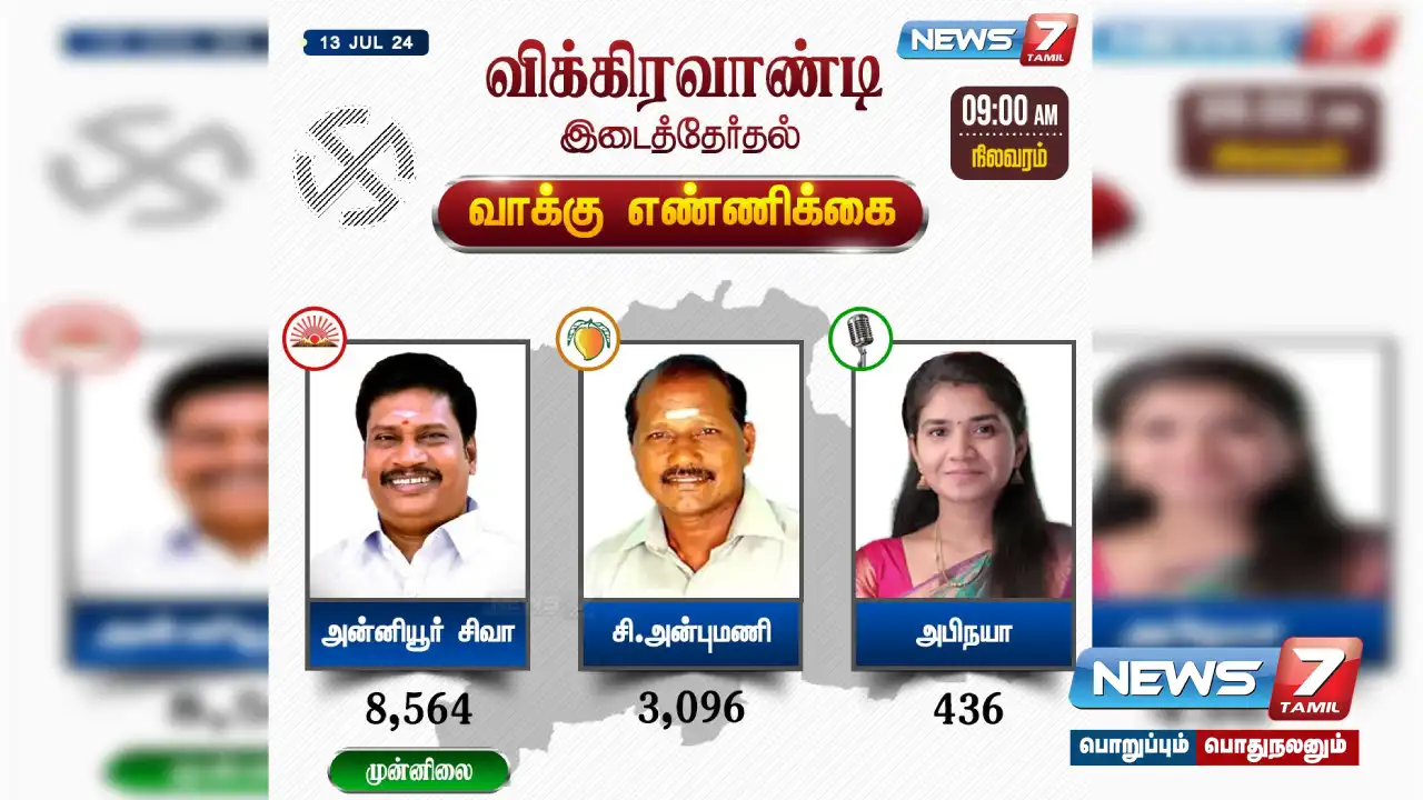 காலை 9 மணி நிலவரம் – திமுக வேட்பாளர் அன்னியூர் சிவா முன்னிலைhttps://t.co/WciCN2SiwX | #ResultsWithNews7Tamil | #Tamilnadu | #Villupuram | #Vikravandi | #VikravandiElection | #VikravandiByeElection | #Electionresult | #ElectionResults | #DMK | #MKStalin | #PMK |… pic.twitter.com/MdDz33hmF2