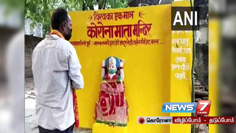 உத்தரபிரதேச மாநிலம் சுக்லாப்பூர் என்ற கிராமத்தில், இந்த சிலையை கிராம மக்கள் அமைத்துள்ளனர். சாமிக்கும் முகக்கவசத்தை அணிந்து வடிவமைத்துள்ளனர். கடந்த ஒன்றரை வருடமாக மக்களை வதைத்து வரும் கொரோனாவை விரைவில் ஒழிக்க வேண்டும் என்றும் தினமும் புனித நீர் தெளித்து பூஜைகள் செய்தும் வருகின்றனர்.