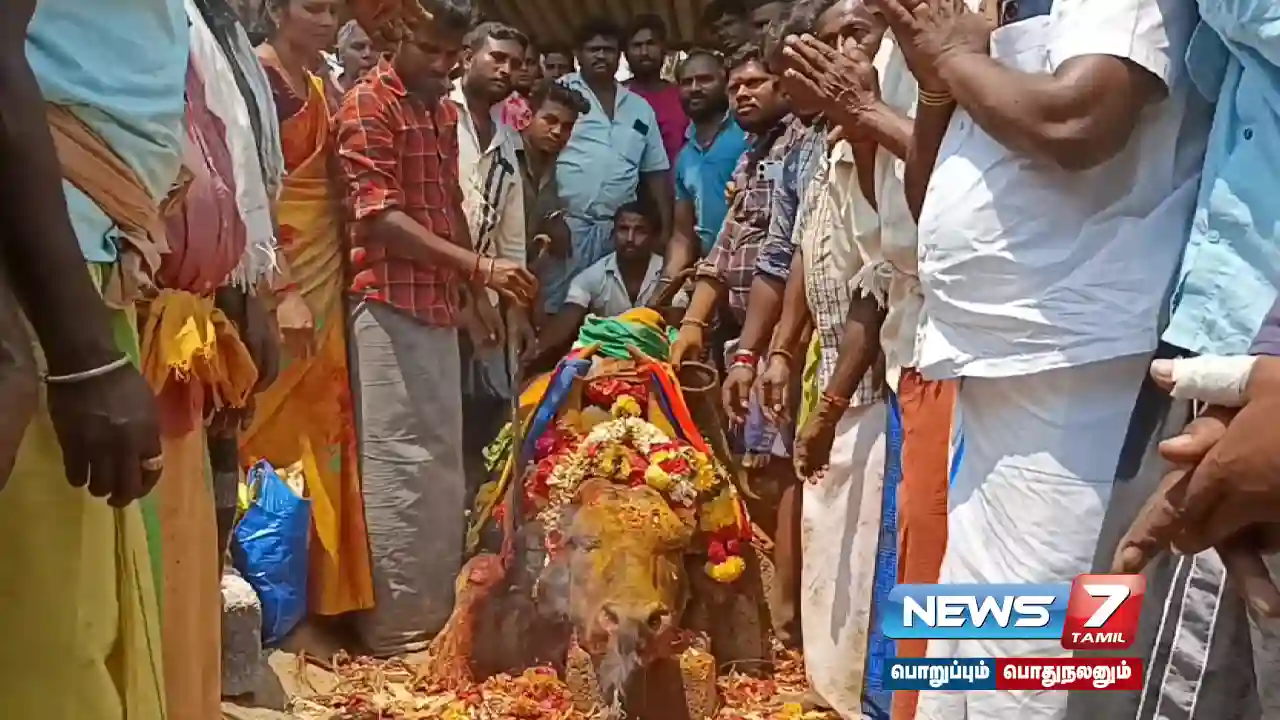 இந்த நிலையில், காளை மாடு வயது முதிர்வின் காரணமாக நேற்று மதியம் கோயில் வளாகத்திலேயே படுத்த நிலையில் இறந்துள்ளது. இதையறிந்த கிராம மக்கள் அதிர்ச்சியடைந்து, காளை மாடுக்கு கண்ணீர் அஞ்சலி செலுத்தினர். தொடர்ந்து மாலை அணிவித்தும், மஞ்சள் குங்குமம் பூசியும் மரியாதை செலுத்தினர். பாசமான பிள்ளையாக வளர்ந்து வந்த காளை மாடு இறந்த செய்தி கேட்டு அக்கம்பக்கத்து கிராம மக்களும், வெளியூர் சென்றிருந்த மக்களும், வந்து நேரடியாக கண்ணீர் அஞ்சலி செலுத்தினர்.