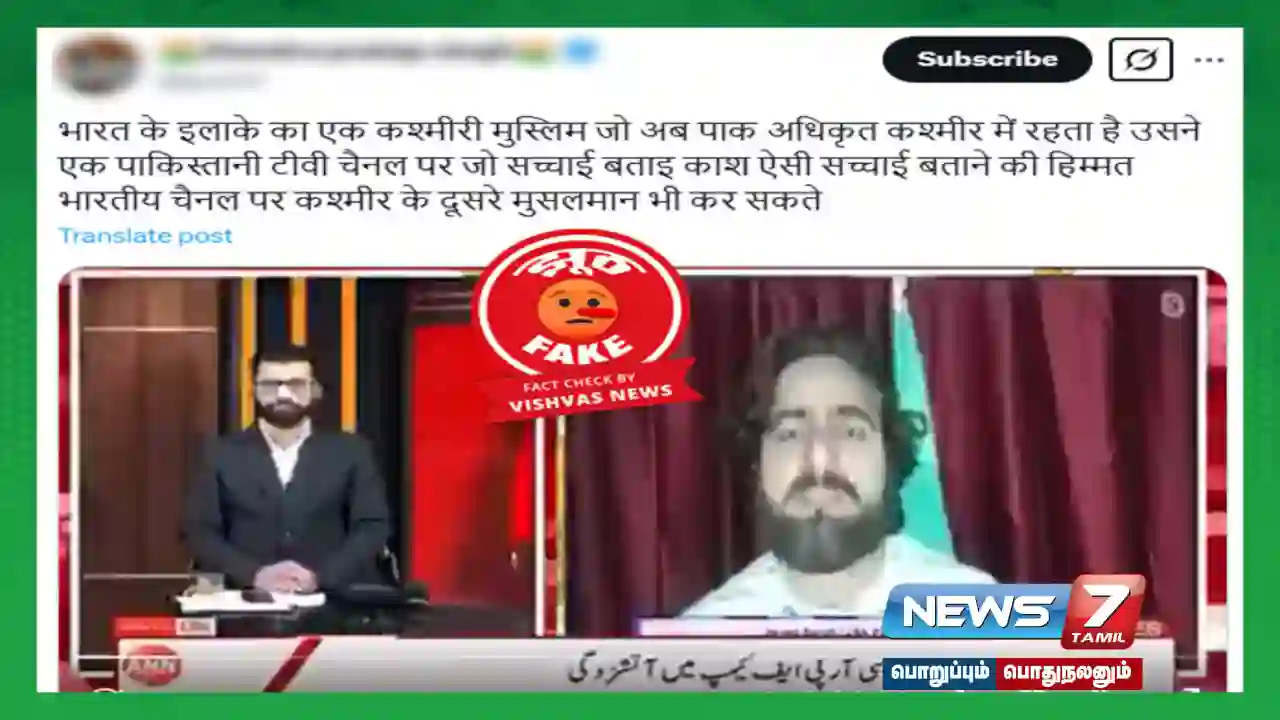 காஷ்மீர் பண்டிதர்கள் குறித்து இளைஞர் ஒருவர் கருத்து தெரிவிக்கும் காணொலி சமூக ஊடகங்களில் வைரலாகி வருகிறது. இதில் அவர் காஷ்மீர் பண்டிதர்களின் படுகொலையைப் பார்த்ததாகக் கூறுவதைக் கேட்கலாம். அதே நேரத்தில், கடந்த காலத்தில் செய்த தவறுகளை நாம் ஏற்றுக்கொள்ள வேண்டும் என்றும் அவர் கூறுகிறார். வீடியோவில் நெறியாளரையும் காணலாம். இதைப் பகிர்ந்த சில பயனர்கள் இந்த காணொலி பாகிஸ்தான் தொலைக்காட்சி சேனலில் இருந்து எடுக்கப்பட்டது என்றும், அதில் பாகிஸ்தான் ஆக்கிரமிப்பு காஷ்மீரில் (PoK) வசிக்கும் ஒரு இளைஞர் காஷ்மீர் பண்டிதர்கள் மீதான அட்டூழியங்கள் குறித்துப் பேசியுள்ளதாகவும் கூறுகின்றனர்.