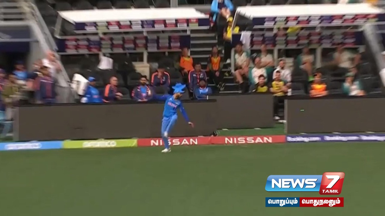 இந்த போட்டியில் ஆஸ்திரேலியா வெற்றி பெற கடைசி ஓவரில் 11 ரன்கள் தேவைப்பட்ட நிலையில் ஓவரின் மூன்றாவது பந்தை பேட் கம்மின்ஸ் லாங் ஆனில் தூக்கி அடிக்க, பவுண்டரி லைனில் நிற்காமல் லைனிலிருந்து கொஞ்சம் முன்பாக நின்ற விராட் கோலி, சிக்ஸருக்கு சென்ற பந்தை ஒற்றை கையில் பிடித்து மிரட்டினார்.