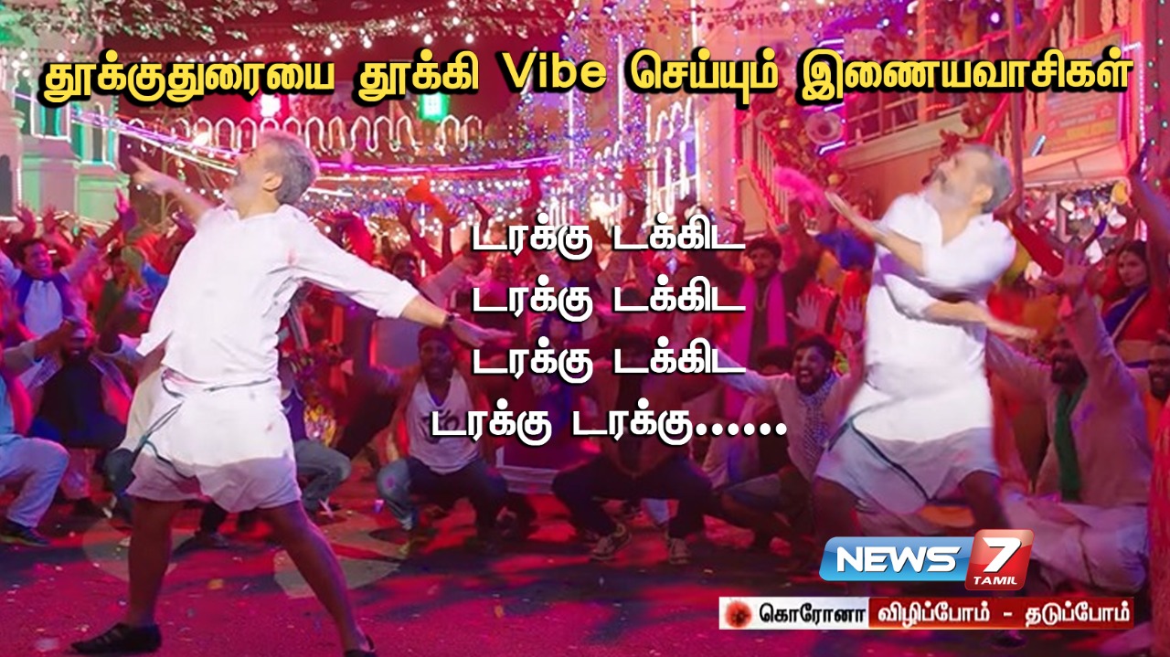 விஸ்வாசம் படத்தின் வெற்றிக்கு மற்றுமொரு முக்கிய காரணம் அதன் பாடல்கள் தான். இதில் இடம் பெற்ற கண்ணான கண்ணே பாடலுக்காக தேசிய விருது பெற்றார் டி. இமான். இப்படத்தில் இடம்பெற்ற மற்றுமொரு பொண்ணான பாடல் தான் ‘அடிச்சி தூக்கு’. மகளை பார்க்க பாம்பேவுக்கு செல்லும் தூக்குதுரை அங்கிருக்கும் மக்களை அங்காளி பங்காளி ஆக்கி குத்தாட்டம் போட்டிருப்பார். பொதுவாக அஜித்துக்கு நடனம் வராது என விஜய் ரசிகர்களும் அஜித் வெறுப்பாளர்களும் கலாய்ப்பதுண்டு. அவர்களின் வாயை அடைக்கும் வகையில் வேட்டியை மடித்துக்கட்டிக்கொண்டு, ‘டரக்கு டக்கிட டரக்கு டக்கிட டரக்கு டக்கிட டரக்கு டரக்கு’ என பொளந்து கட்டியிருப்பார் அஜித். இந்த ருத்ர தாண்டவ நடன காட்சிகள் தான் தற்போது இணையதையே கொளுத்தி எடுத்து வருகிறது.