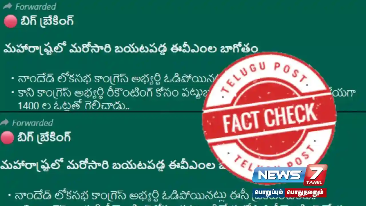 இதன் ஒருபகுதியாக மகாராஷ்டிராவில் மின்னணு வாக்குப்பதிவு இயந்திரங்கள் கசிந்துள்ளதாக வாட்ஸ்அப் பதிவுகள் வைரலாகி வருகின்றன. மகாராஷ்டிராவில் மீண்டும் பிக் பிரேக்கிங் இவிஎம்களில் மோசடி அம்பலமானது * நான்டெட் மக்களவை காங்கிரஸ் வேட்பாளர் தோல்வியடைந்ததாக தேர்தல் ஆணையம் அறிவித்துள்ளது என பரவும் வைரல் செய்தியின் ஸ்கிரீன் ஷாட்டை இங்கே காணலாம்